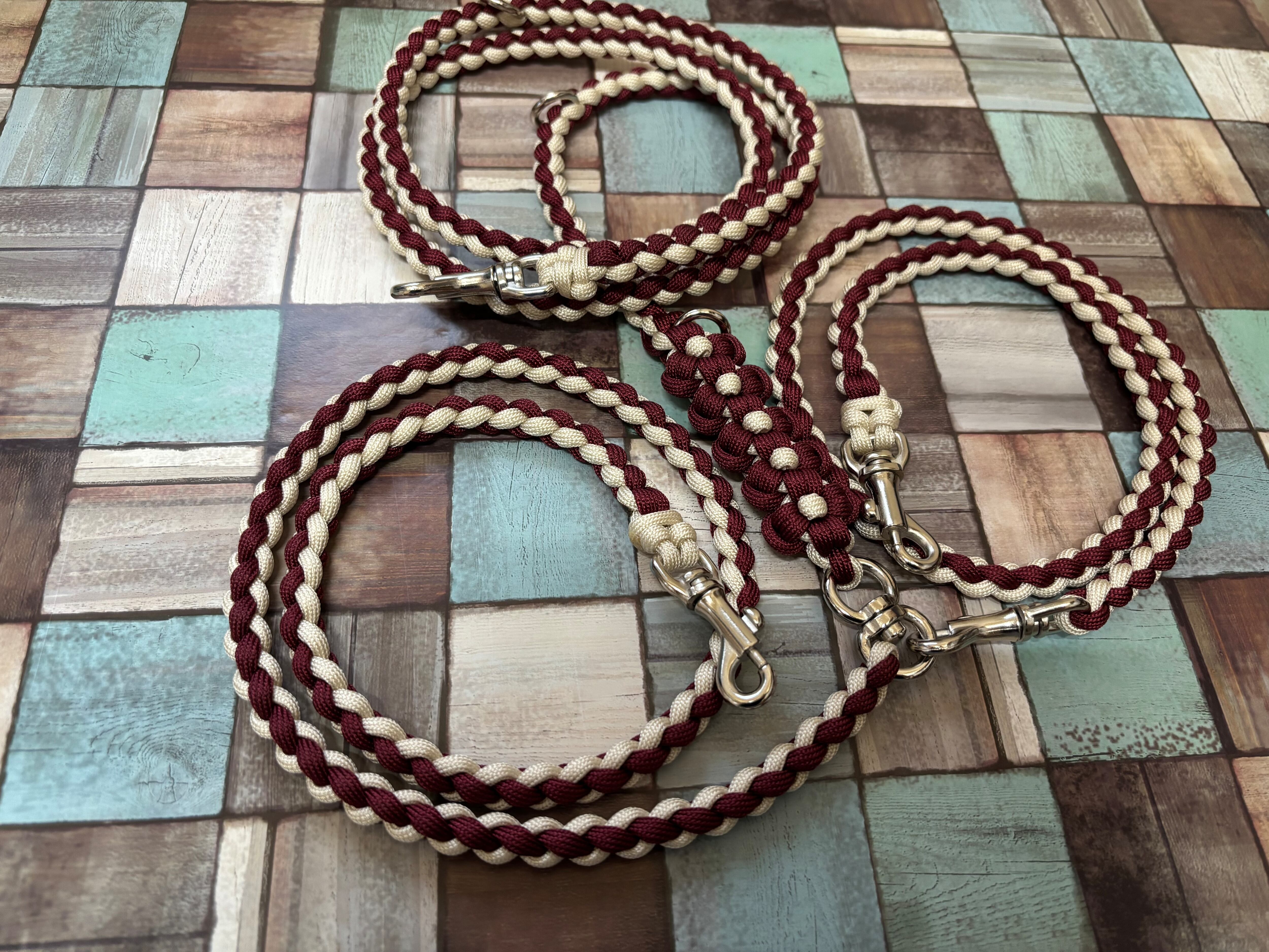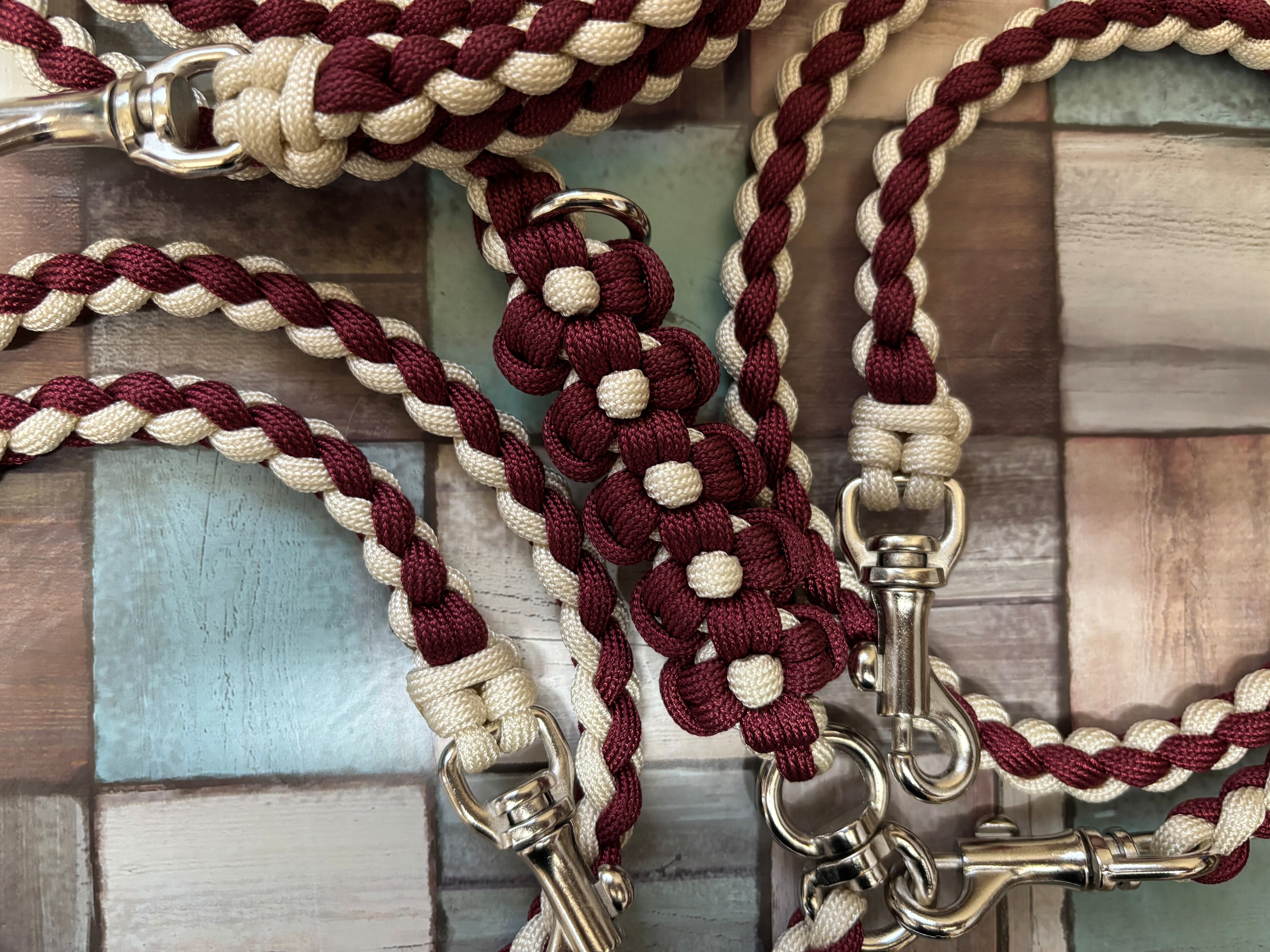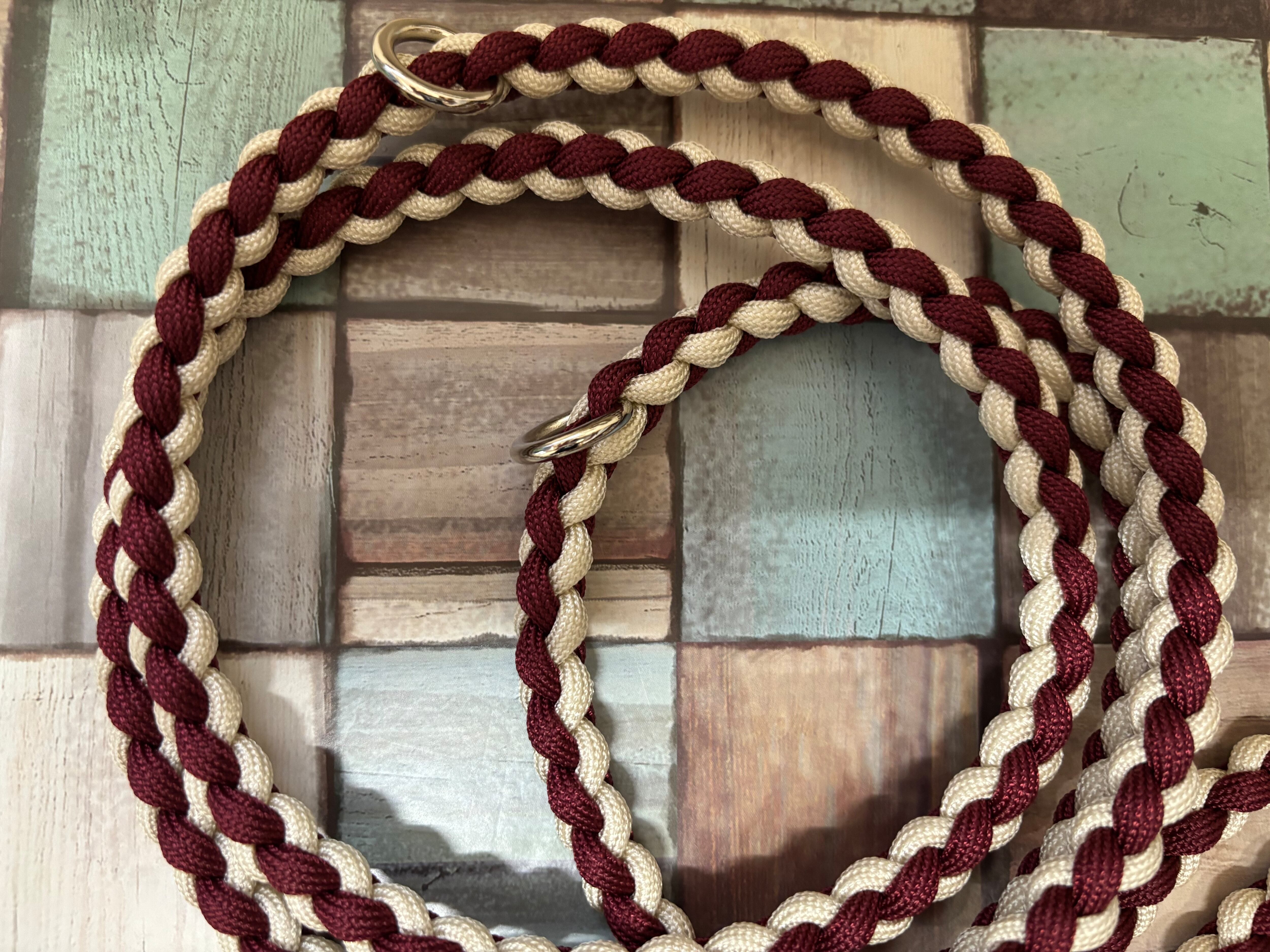 ワインレッド色とベージュ色のパラコードで編み込んでおります。