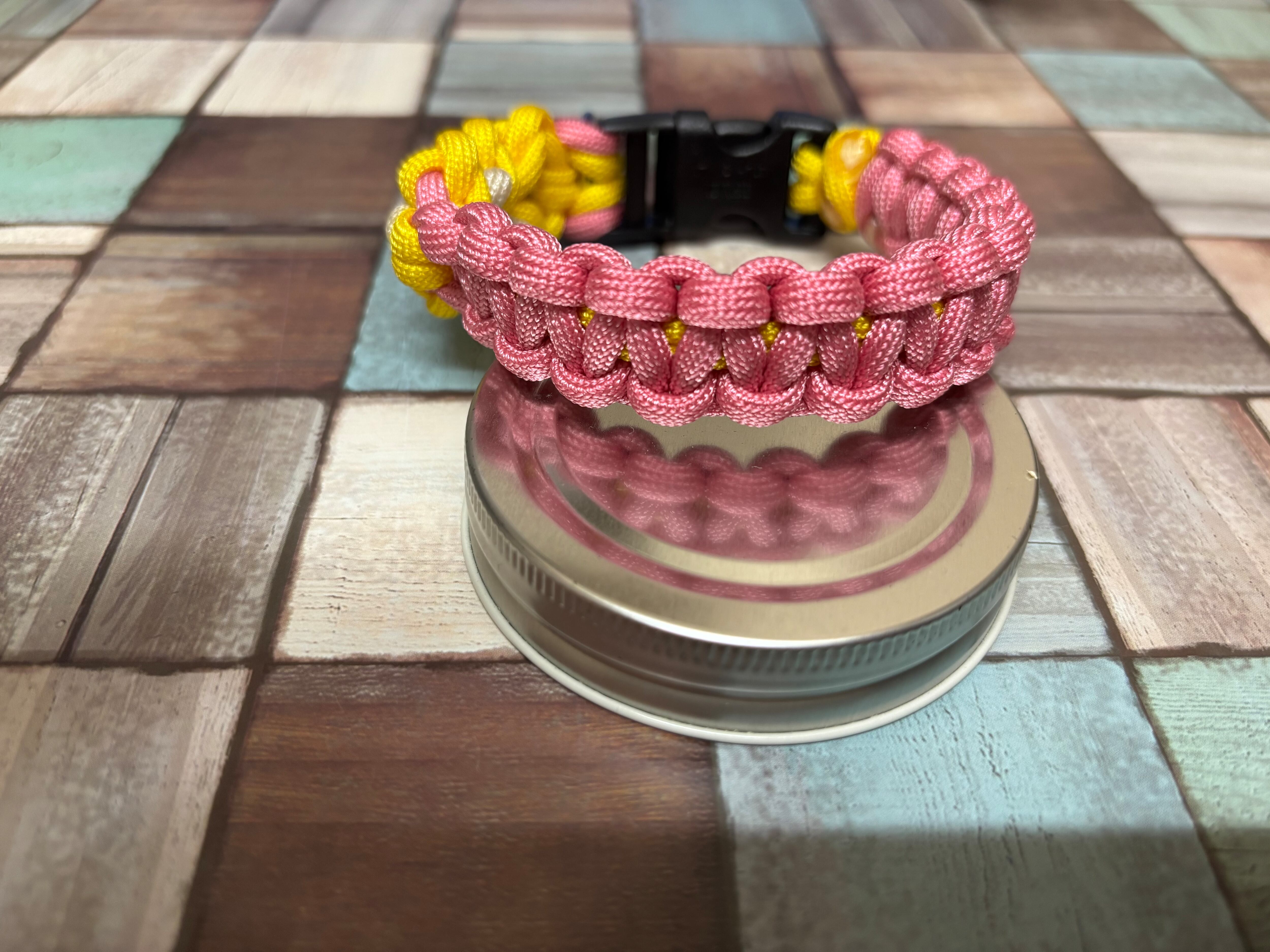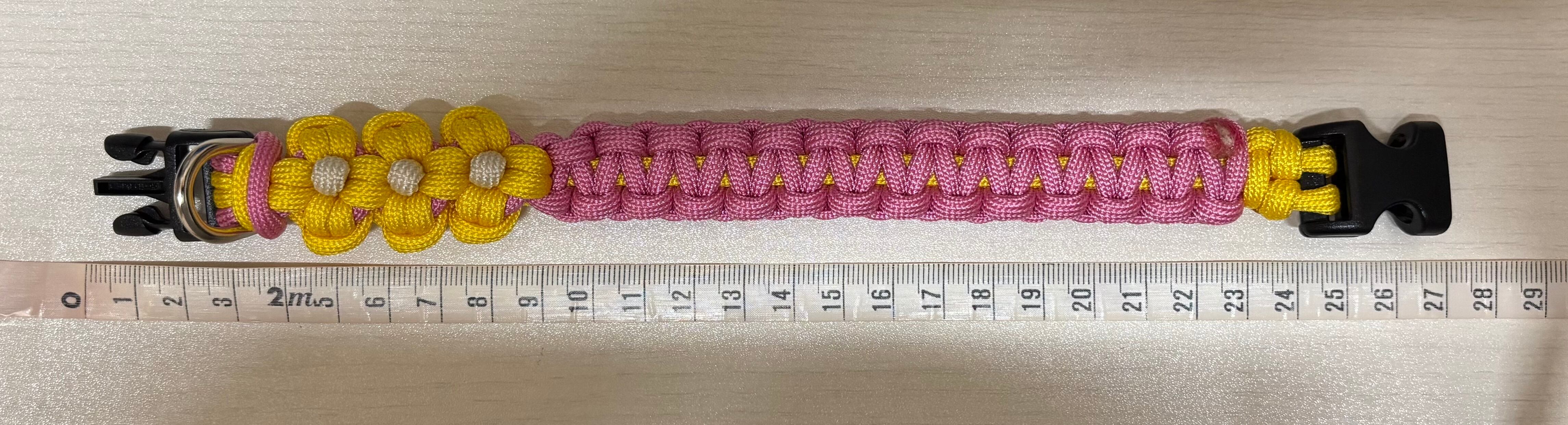 黄色とピンク色のパラコードで編み込んでおります。
