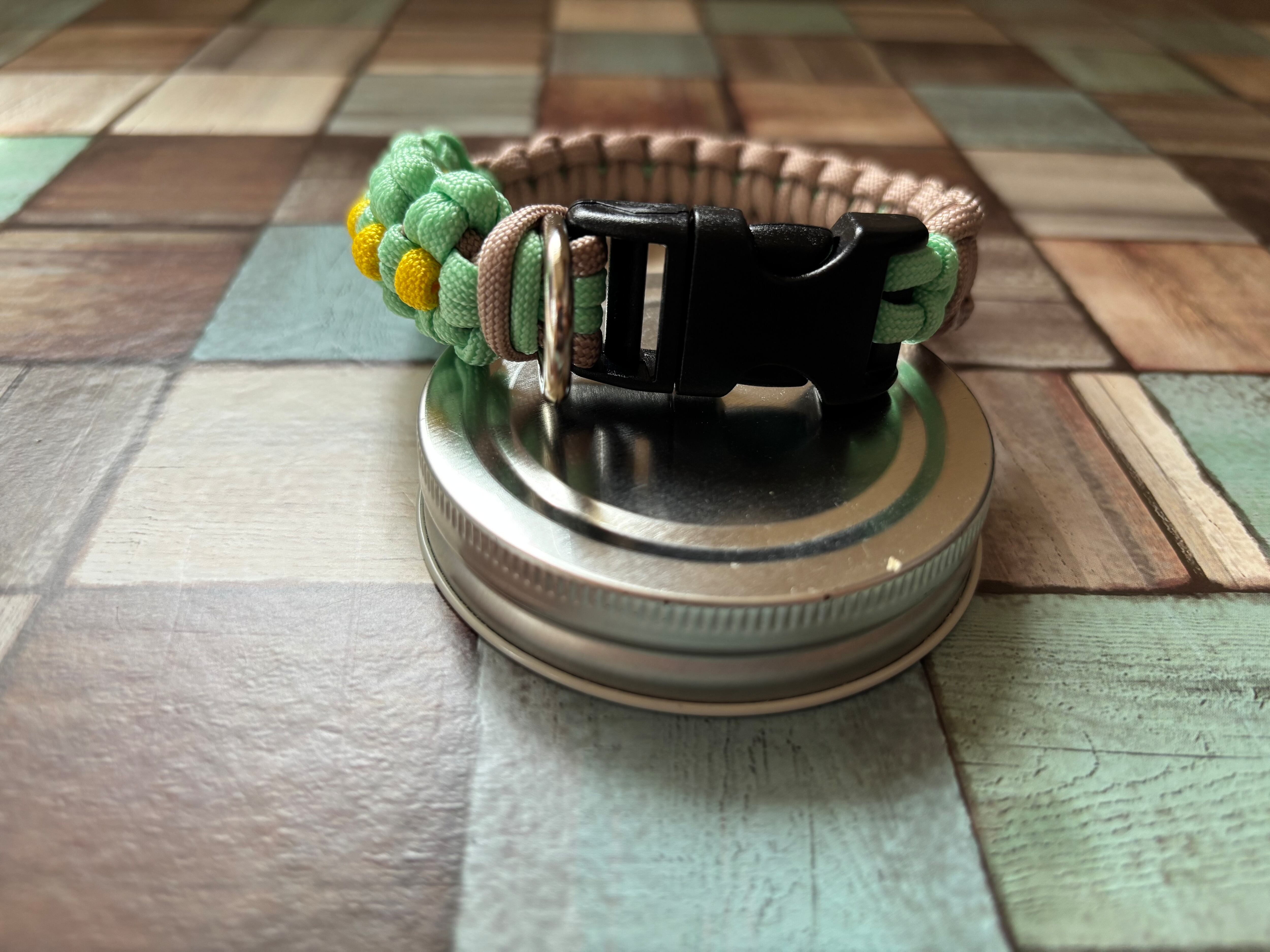 ライムグリーン色とピンクベージュ色のパラコードで編み込んでおります。