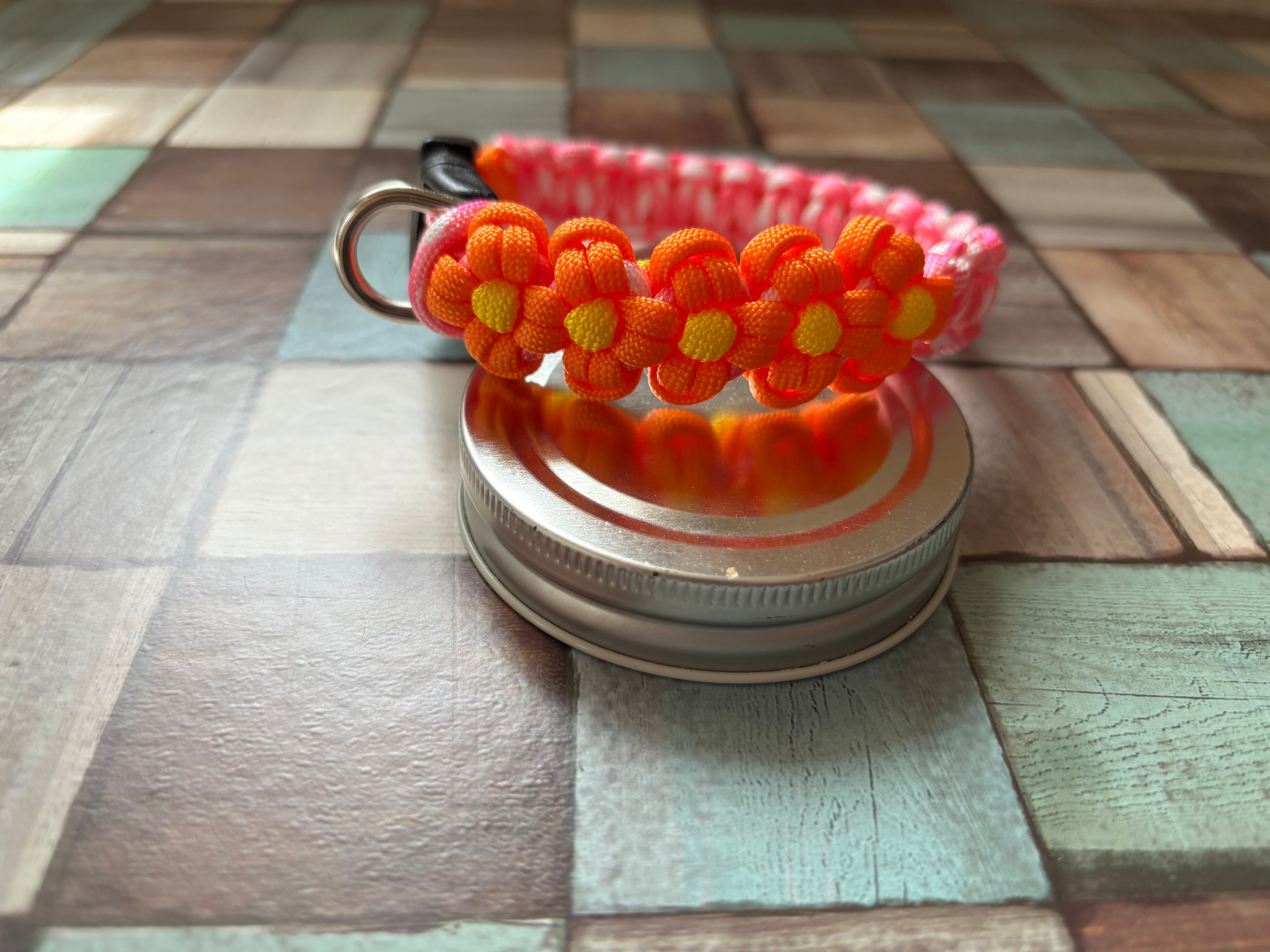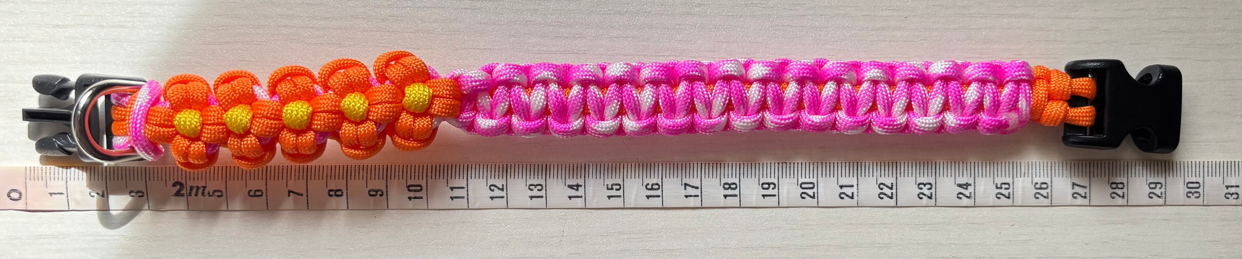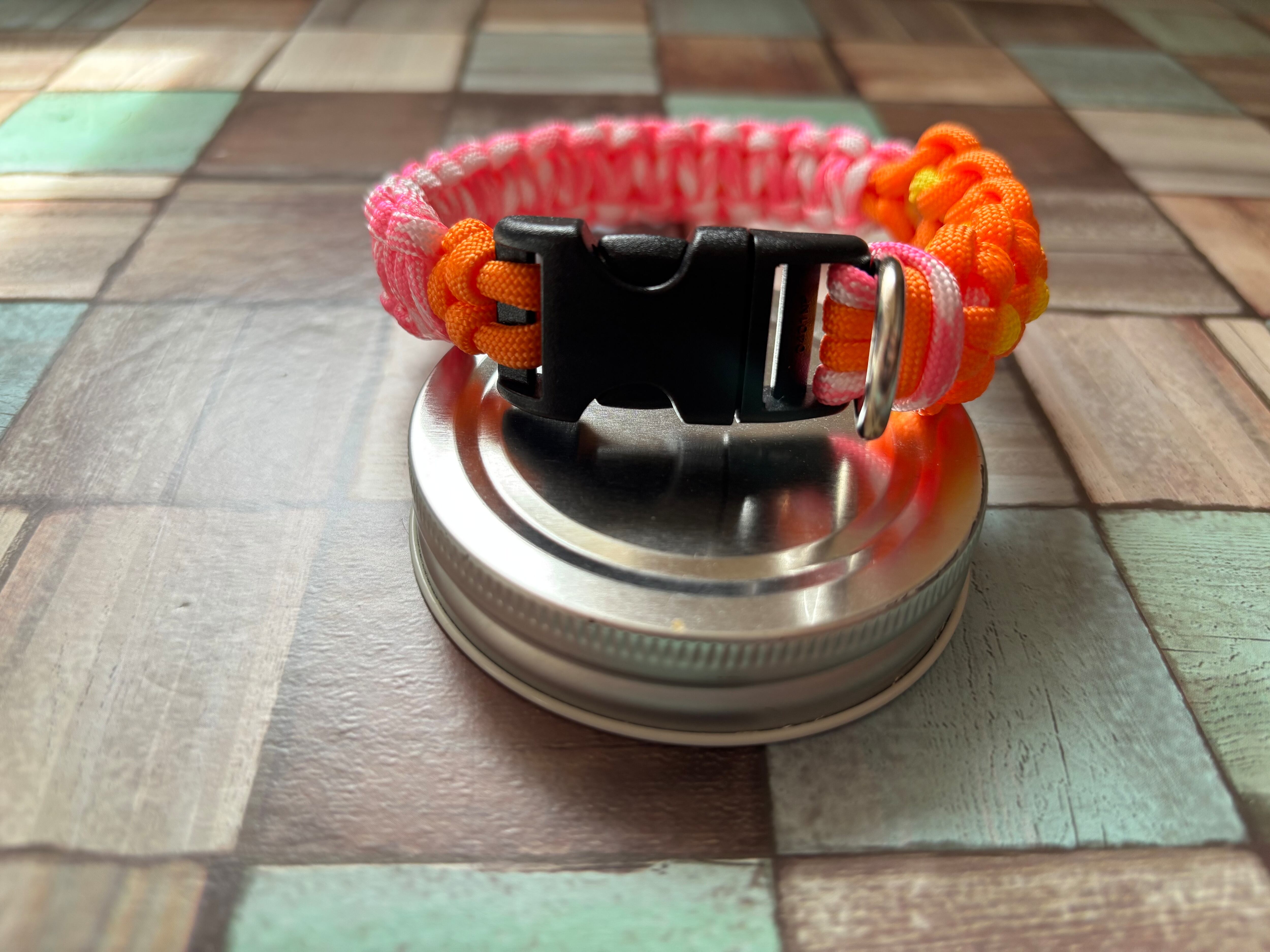 オレンジ色とピンクホワイト色のパラコードで編み込んでおります。