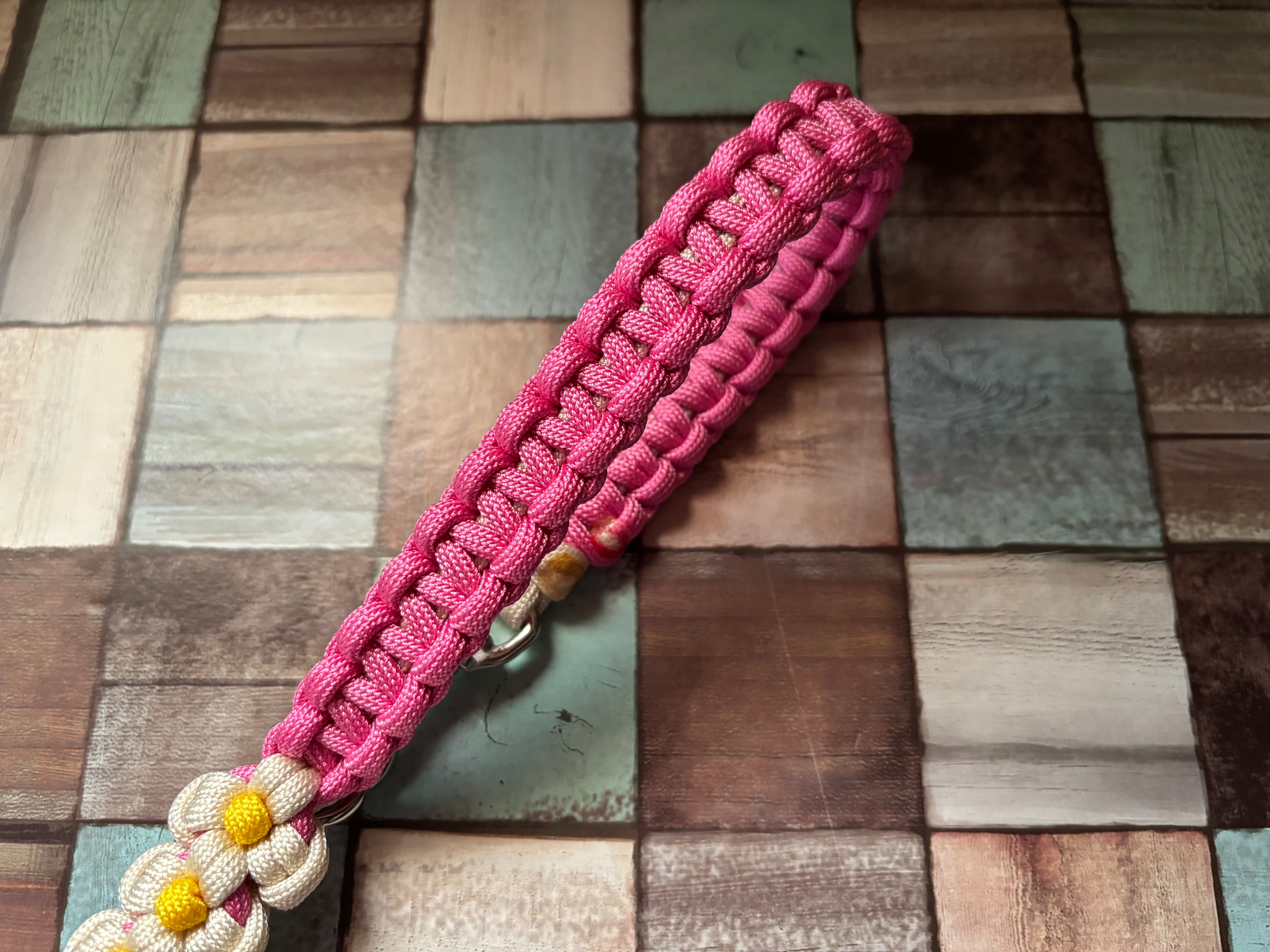 ベージュ色とピンク色とアーミーグリーン色のパラコードで編み込んでおります。