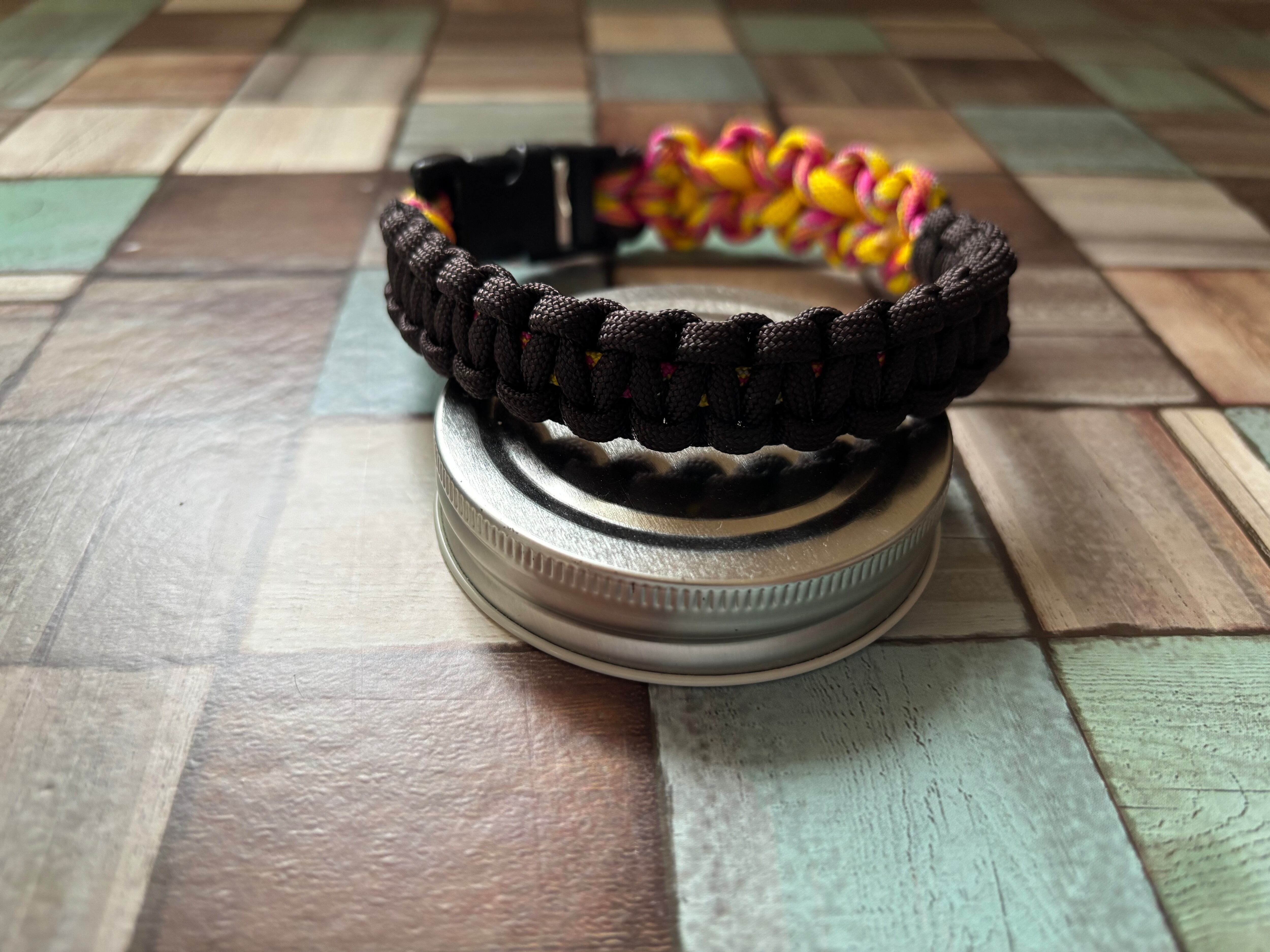 チューリップ色とダークブラウン色のパラコードで編み込んでおります。