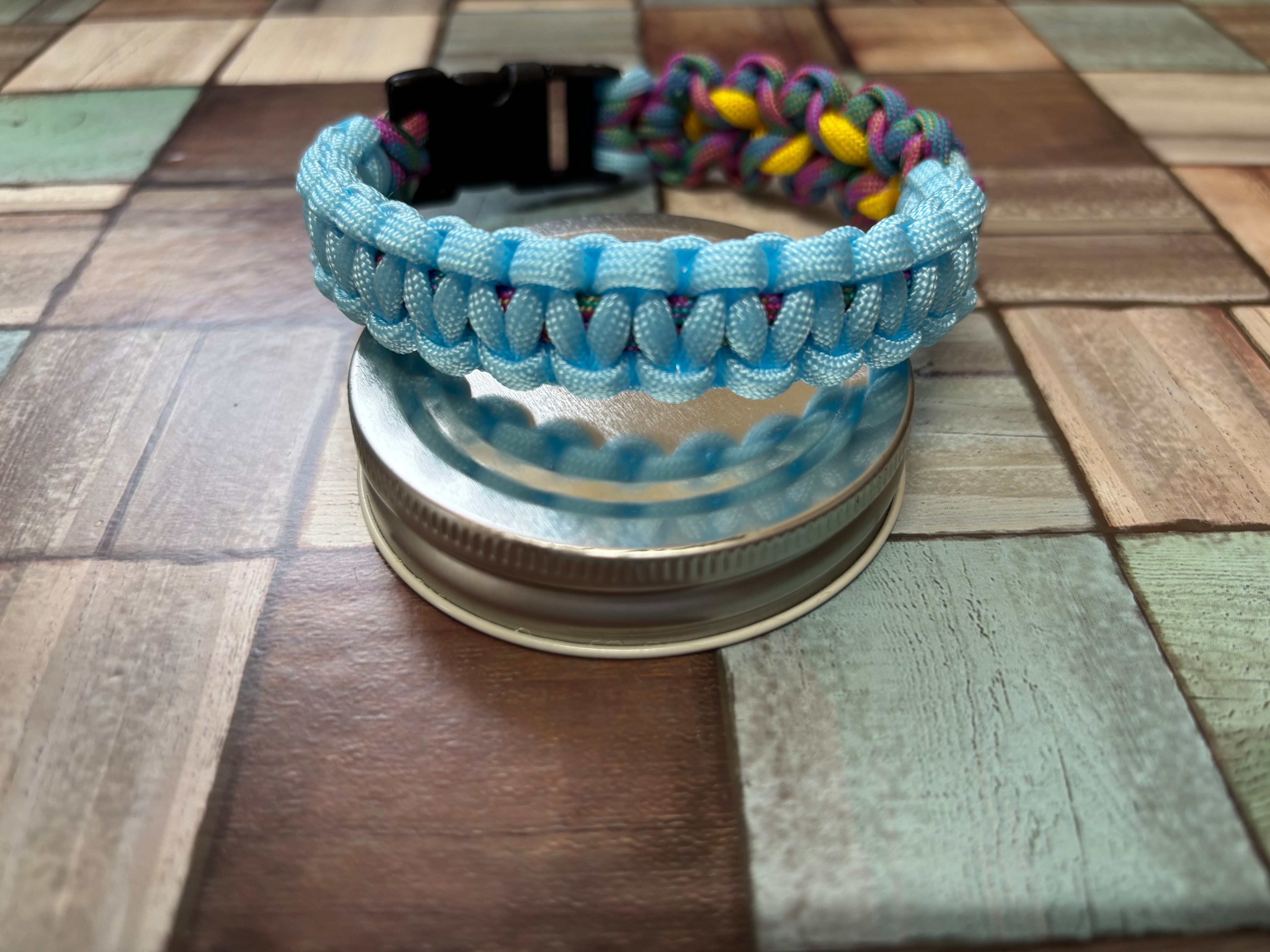 レインボー色とパステルブルー色のパラコードで編み込んでおります。