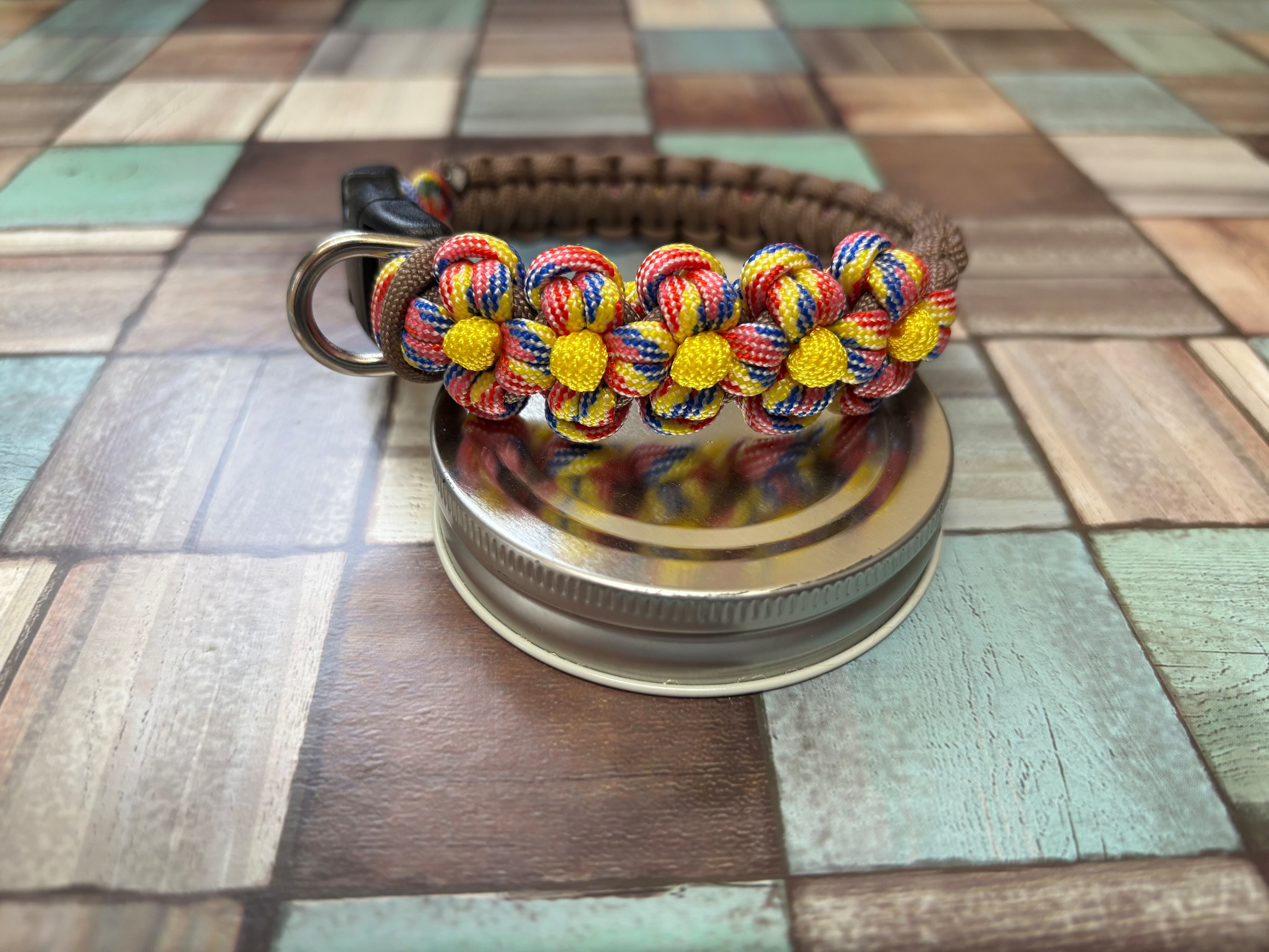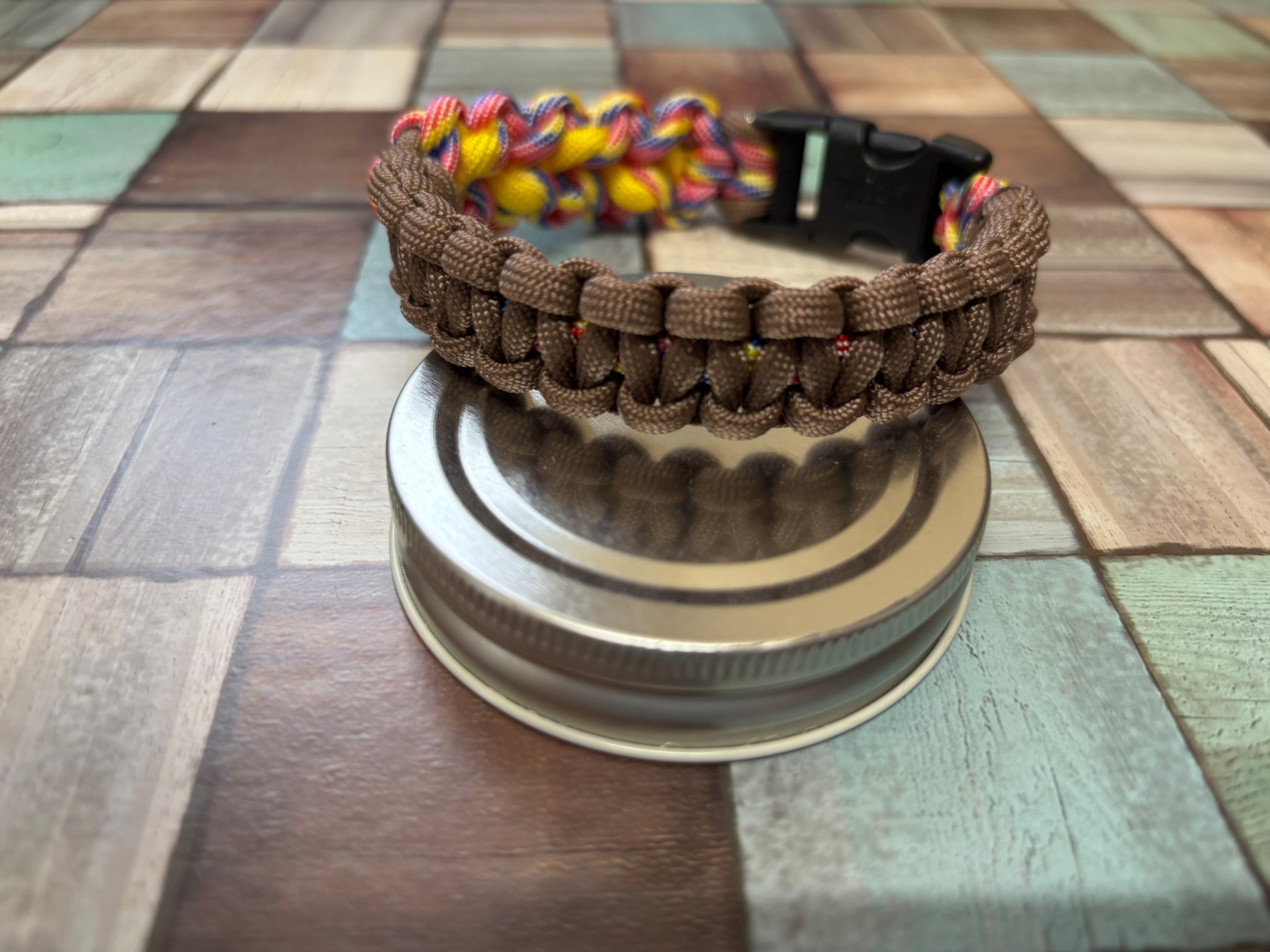 キャンディポップ色とココアブラウン色のパラコードで編み込んでおります。