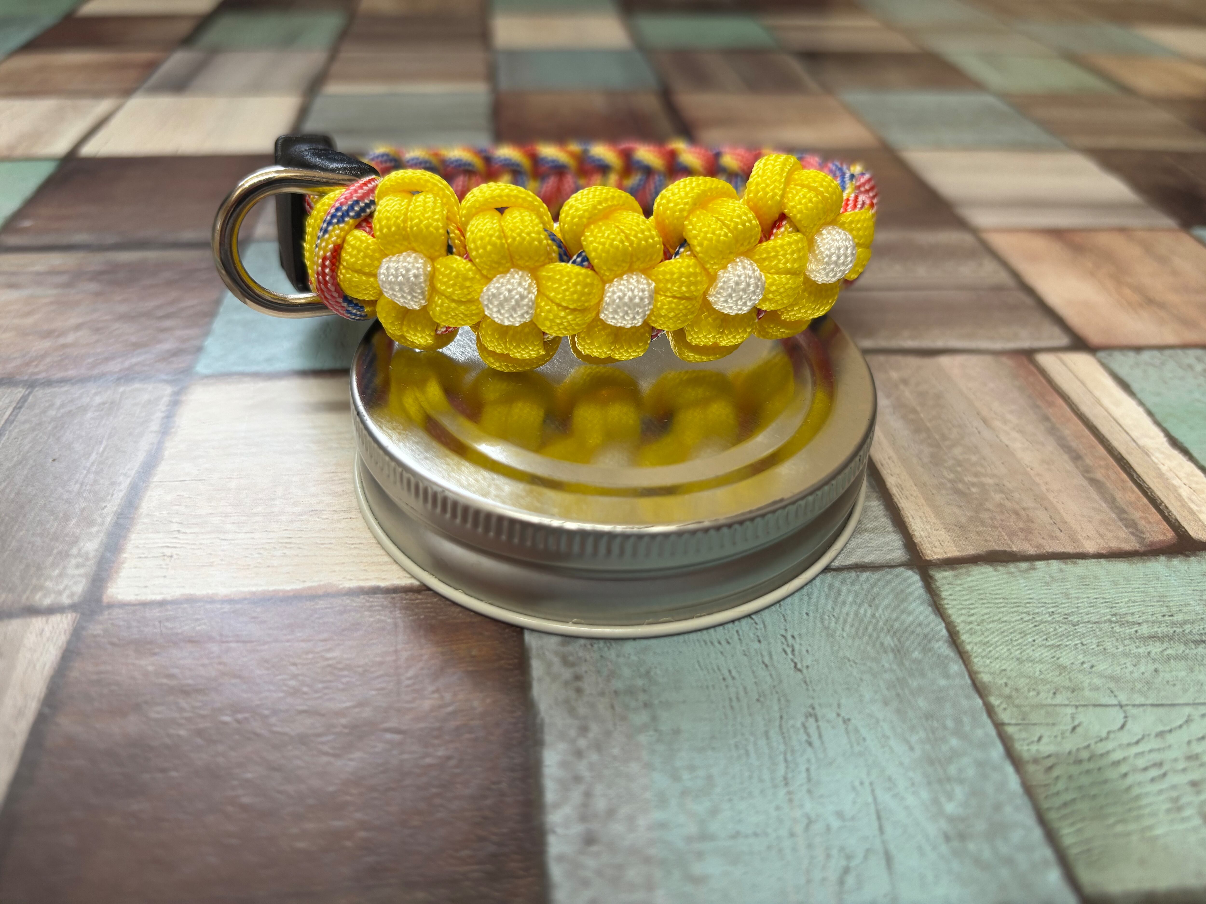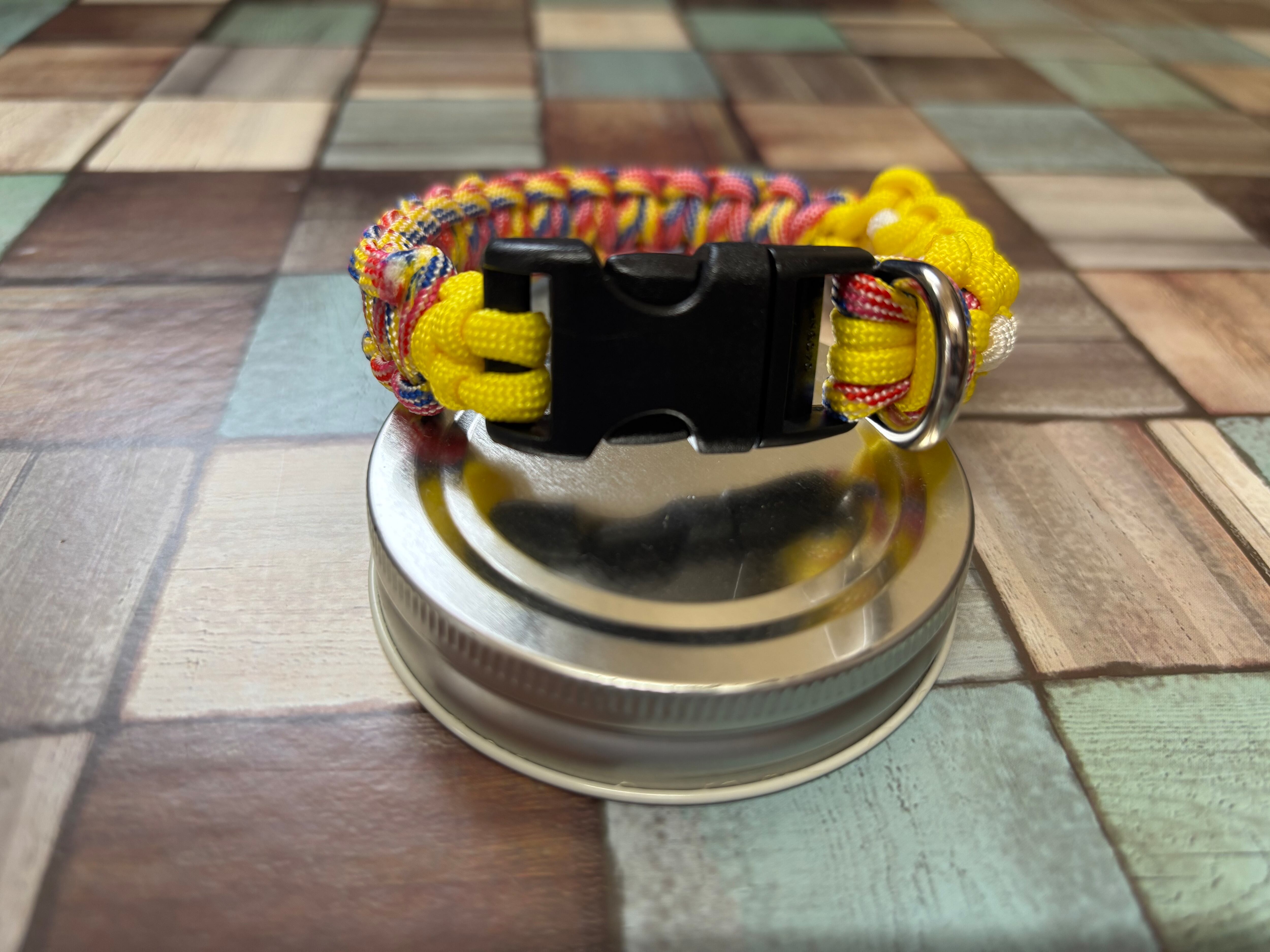 黄色とキャンディポップ色のパラコードで編み込んでおります。