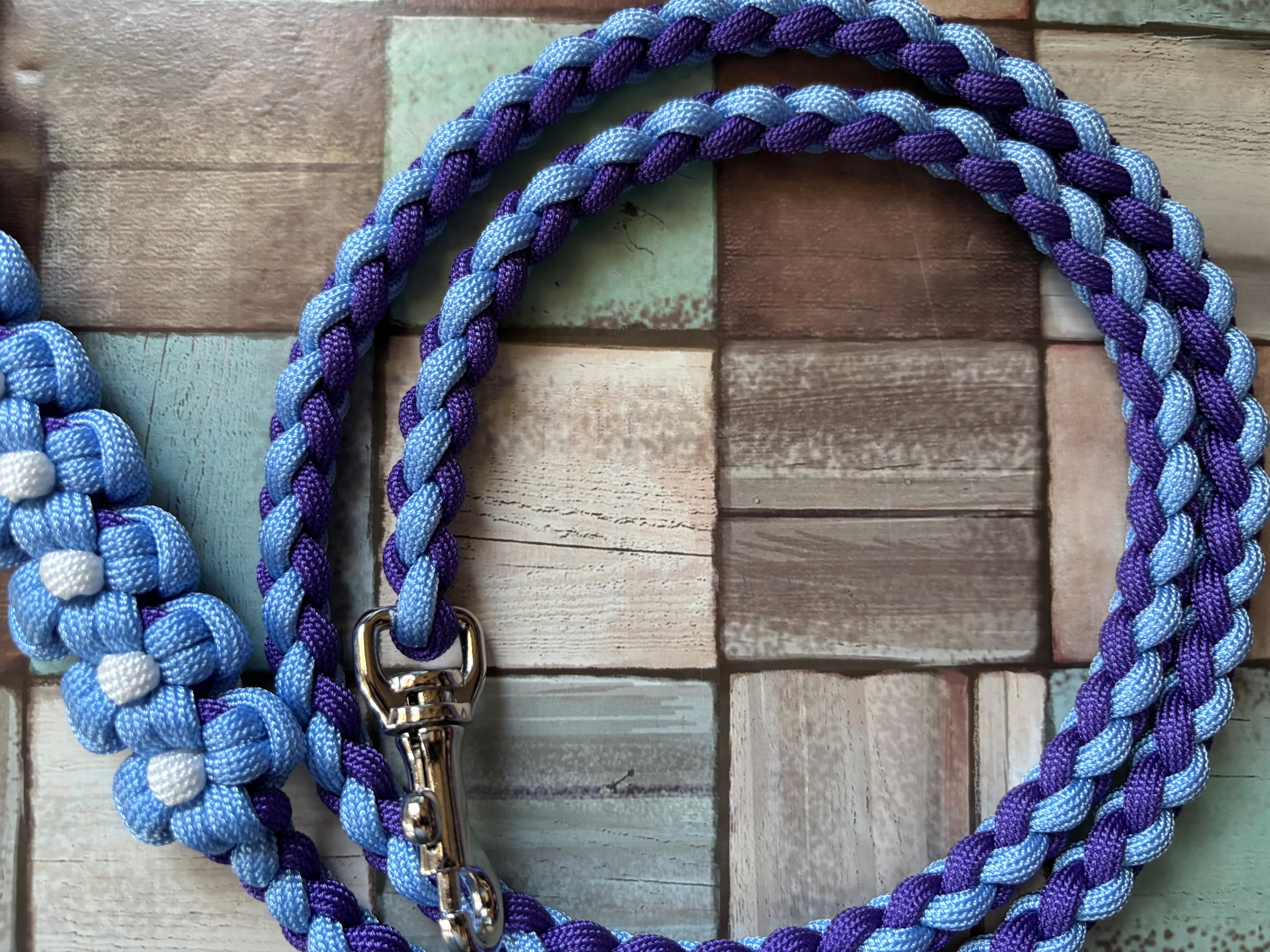 空色と紫色のパラコードで編み込んでおります。