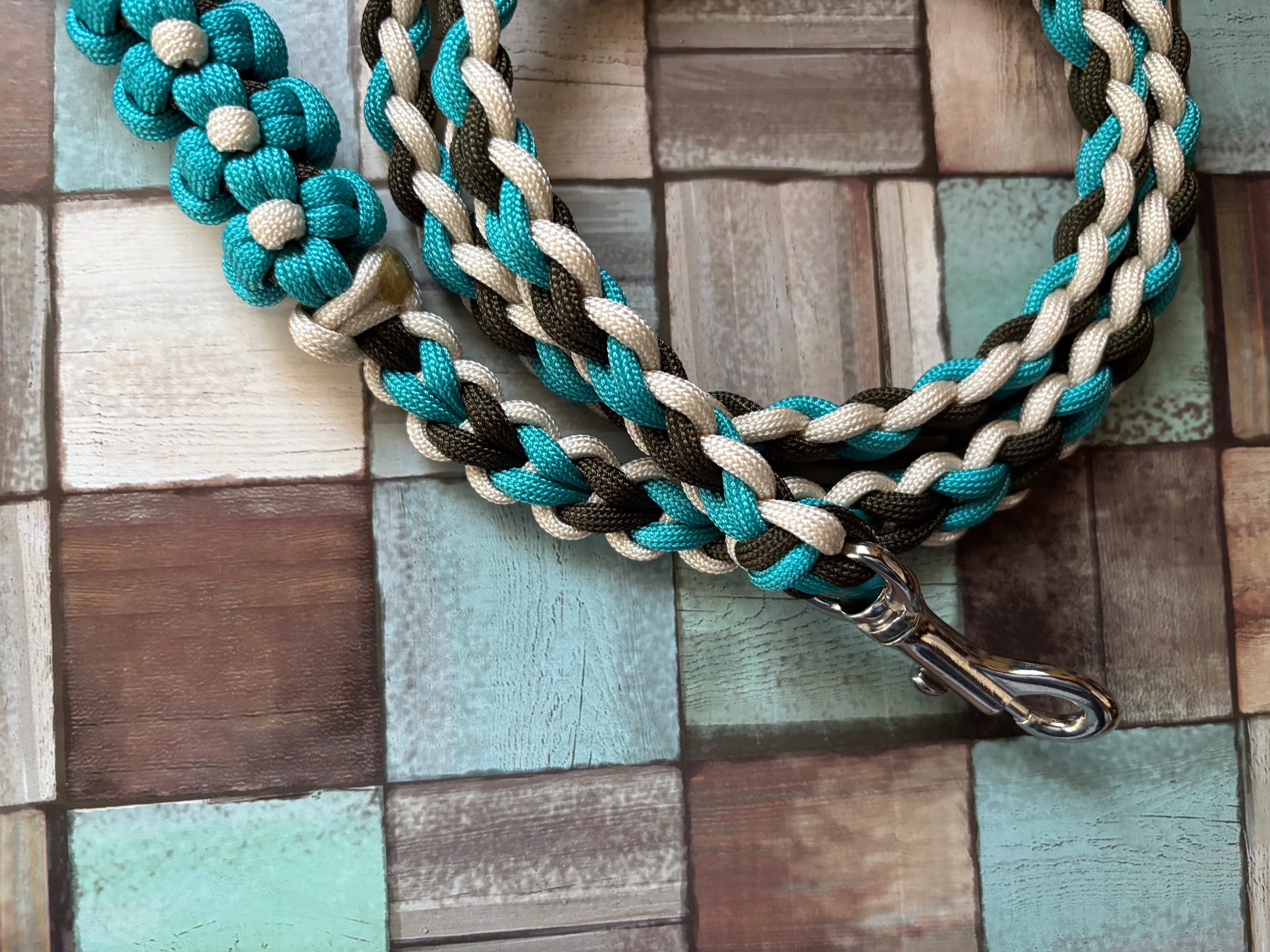 青緑色とアーミーグリーン色とベージュ色のパラコードで編み込んでおります。