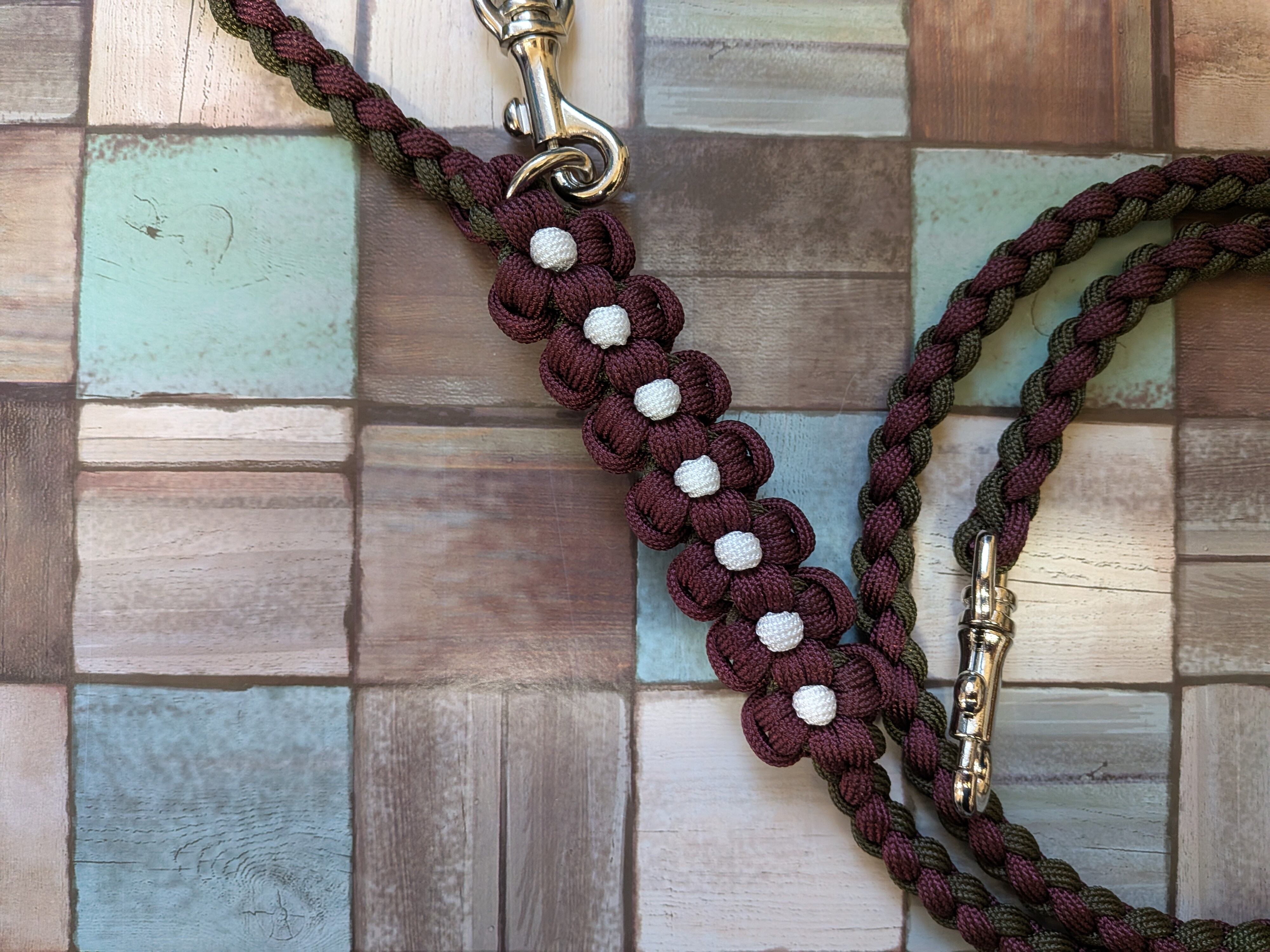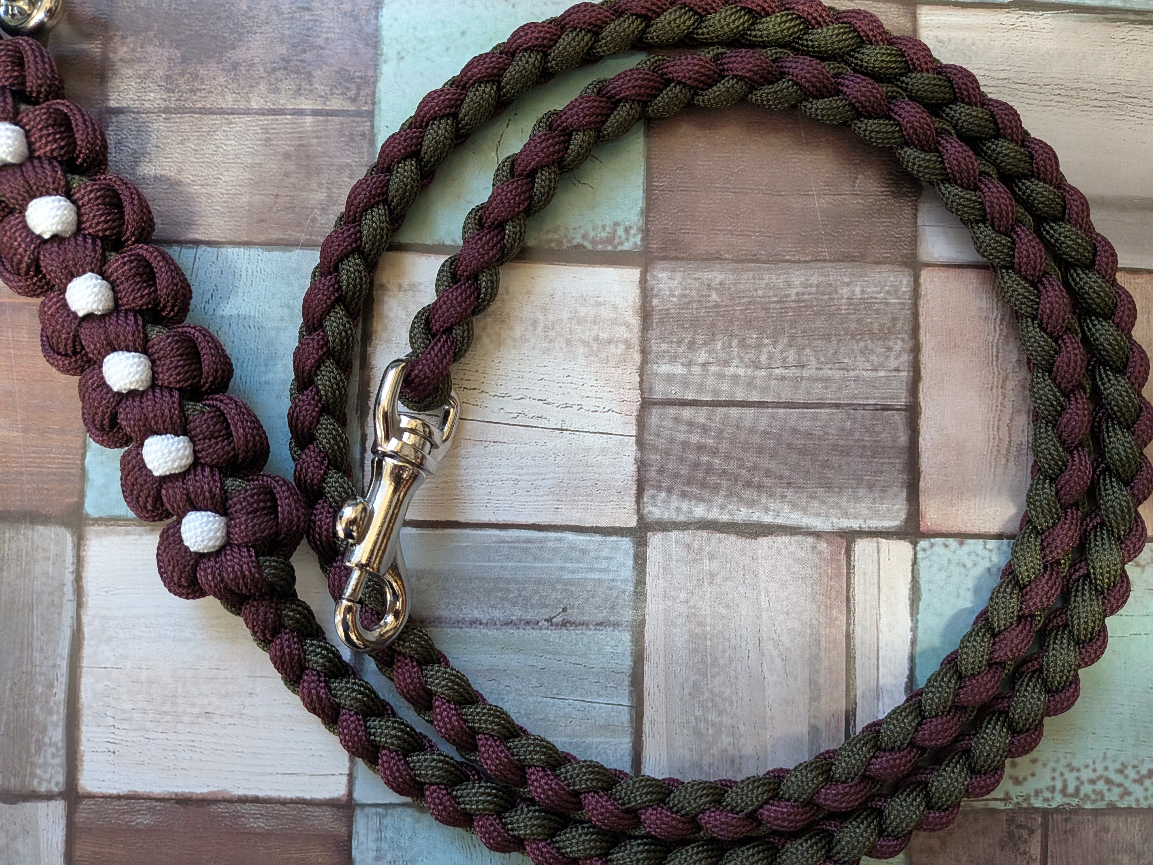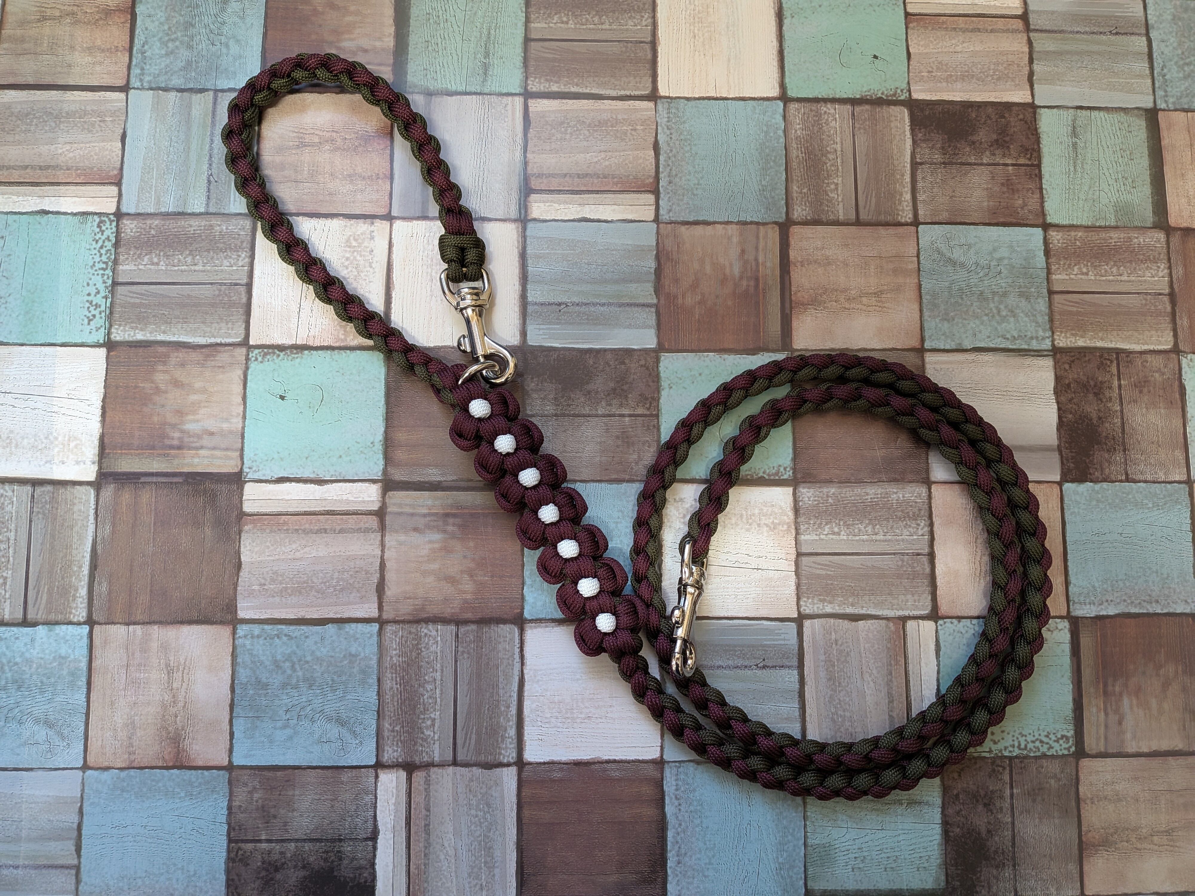 ワインレッド色とアーミーグリーン色のパラコードで編み込んでおります。