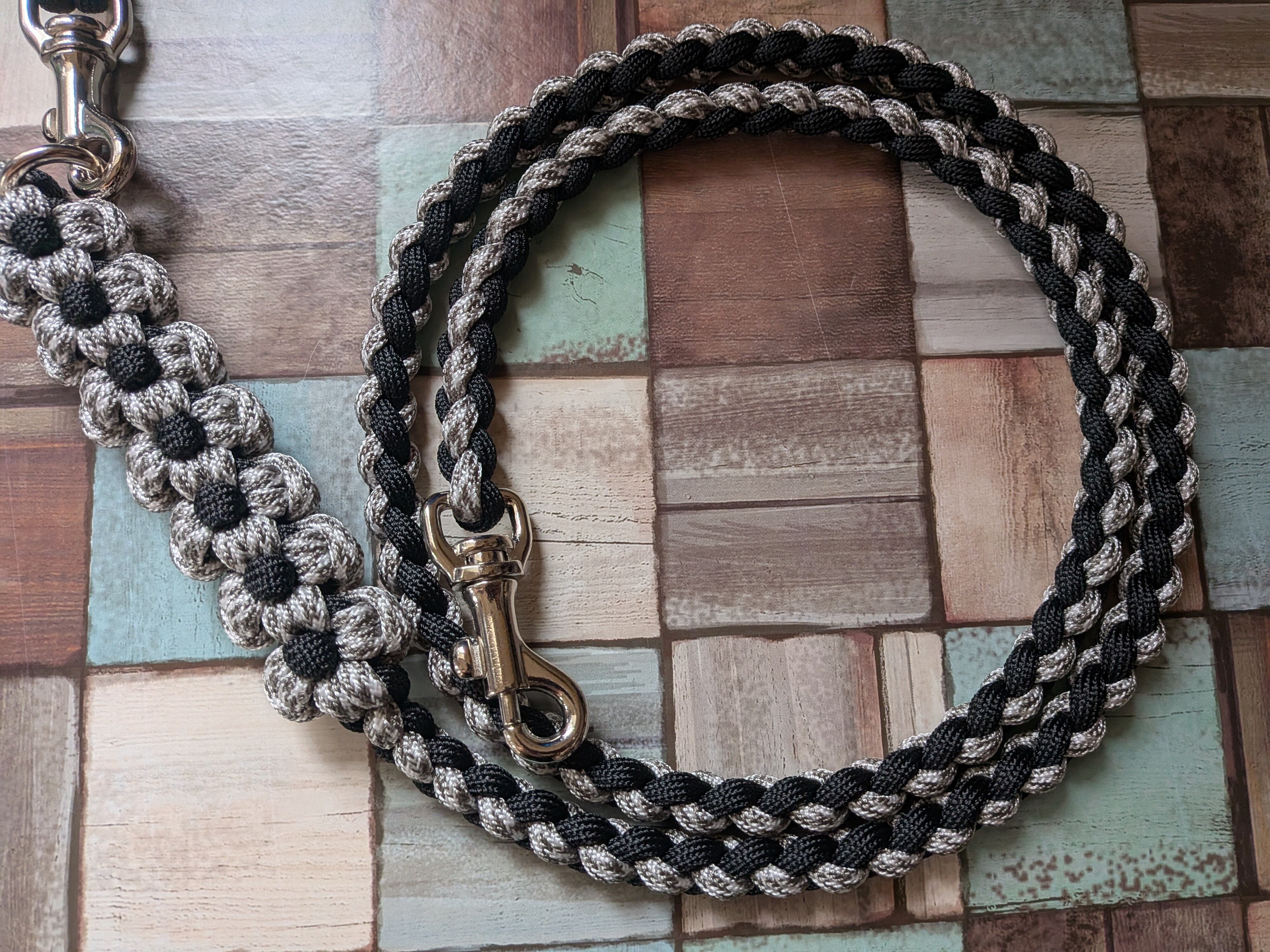 白グレー色と黒色のパラコードで編み込んでおります。