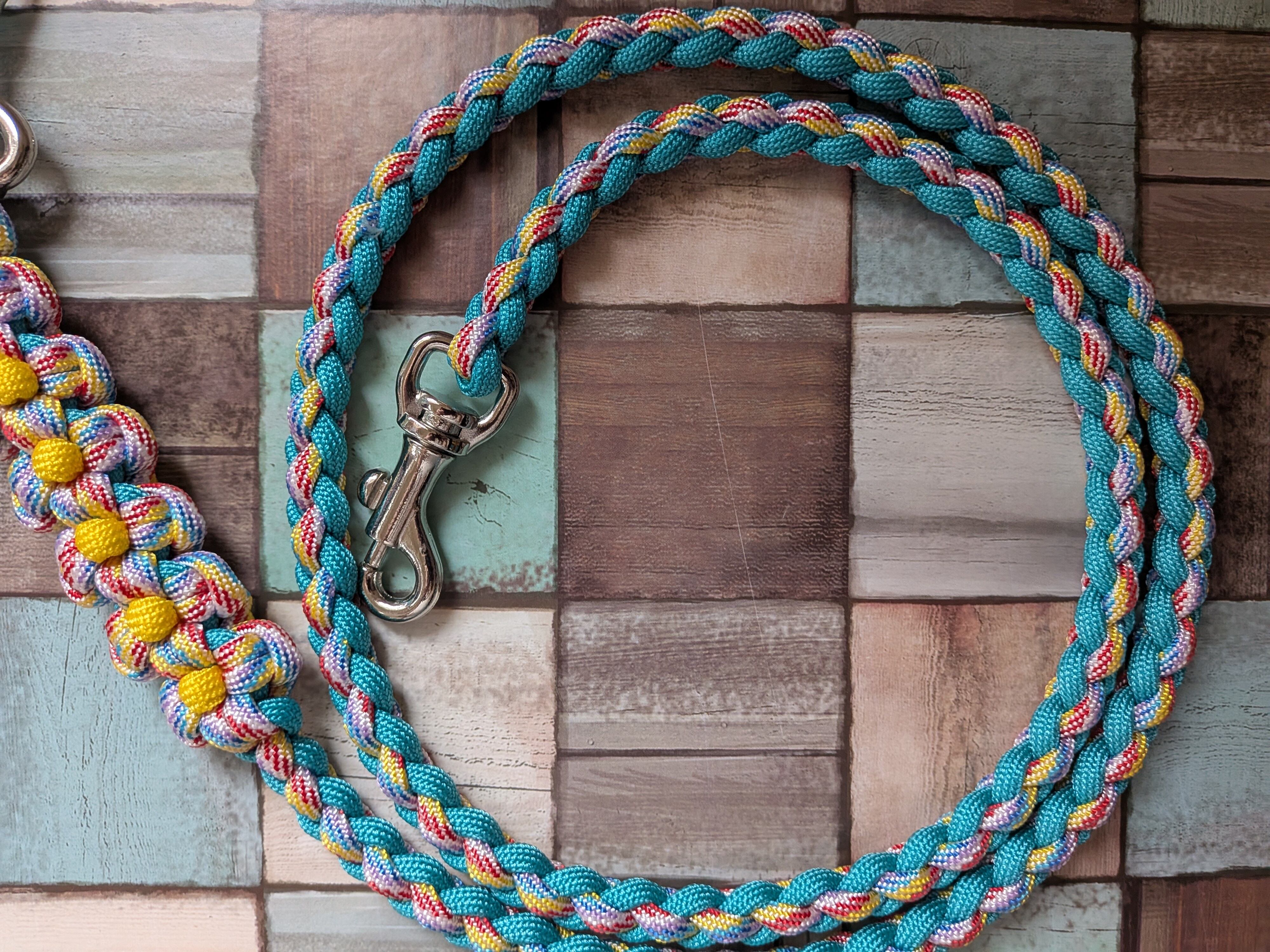 虹色と青緑色のパラコードで編み込んでおります。
