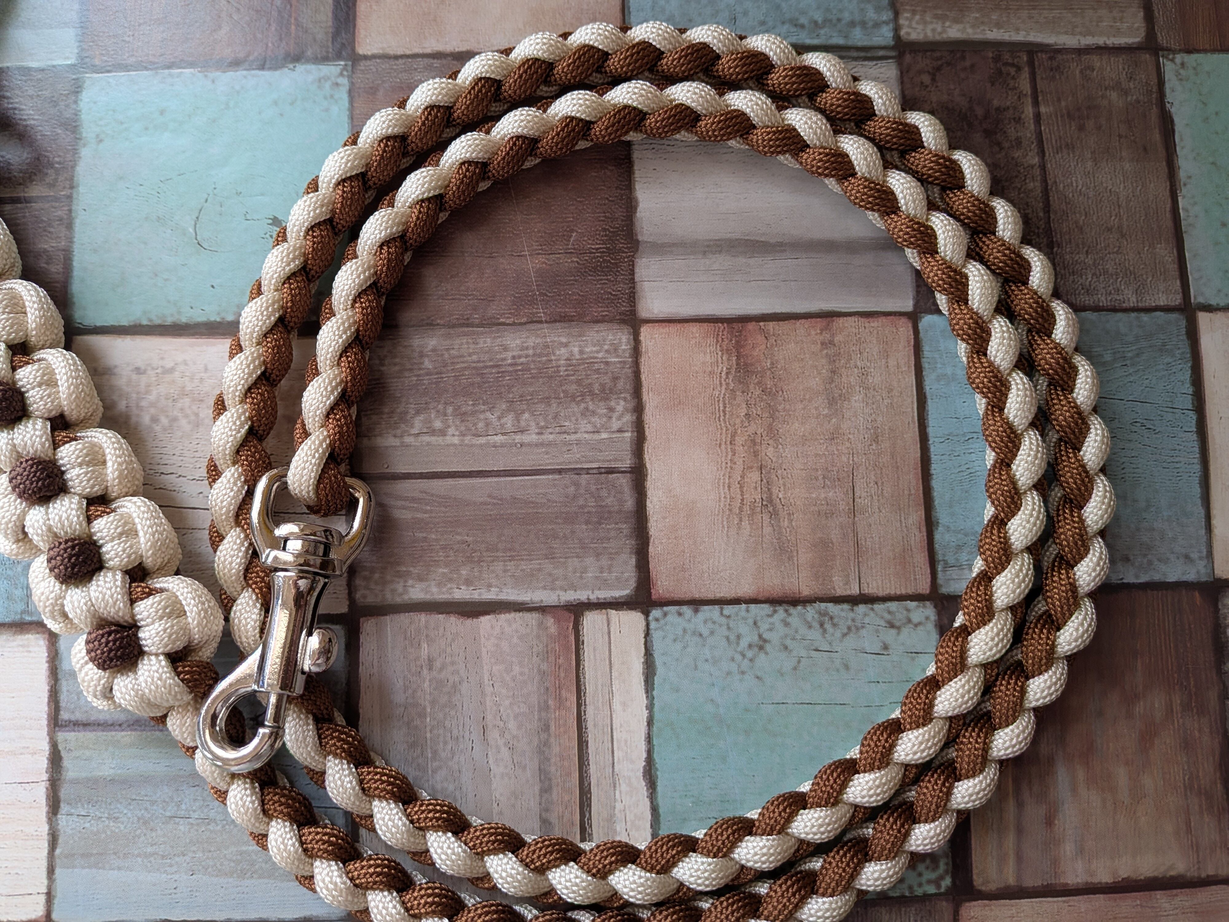 ベージュ色と茶色のパラコードで編み込んでおります。