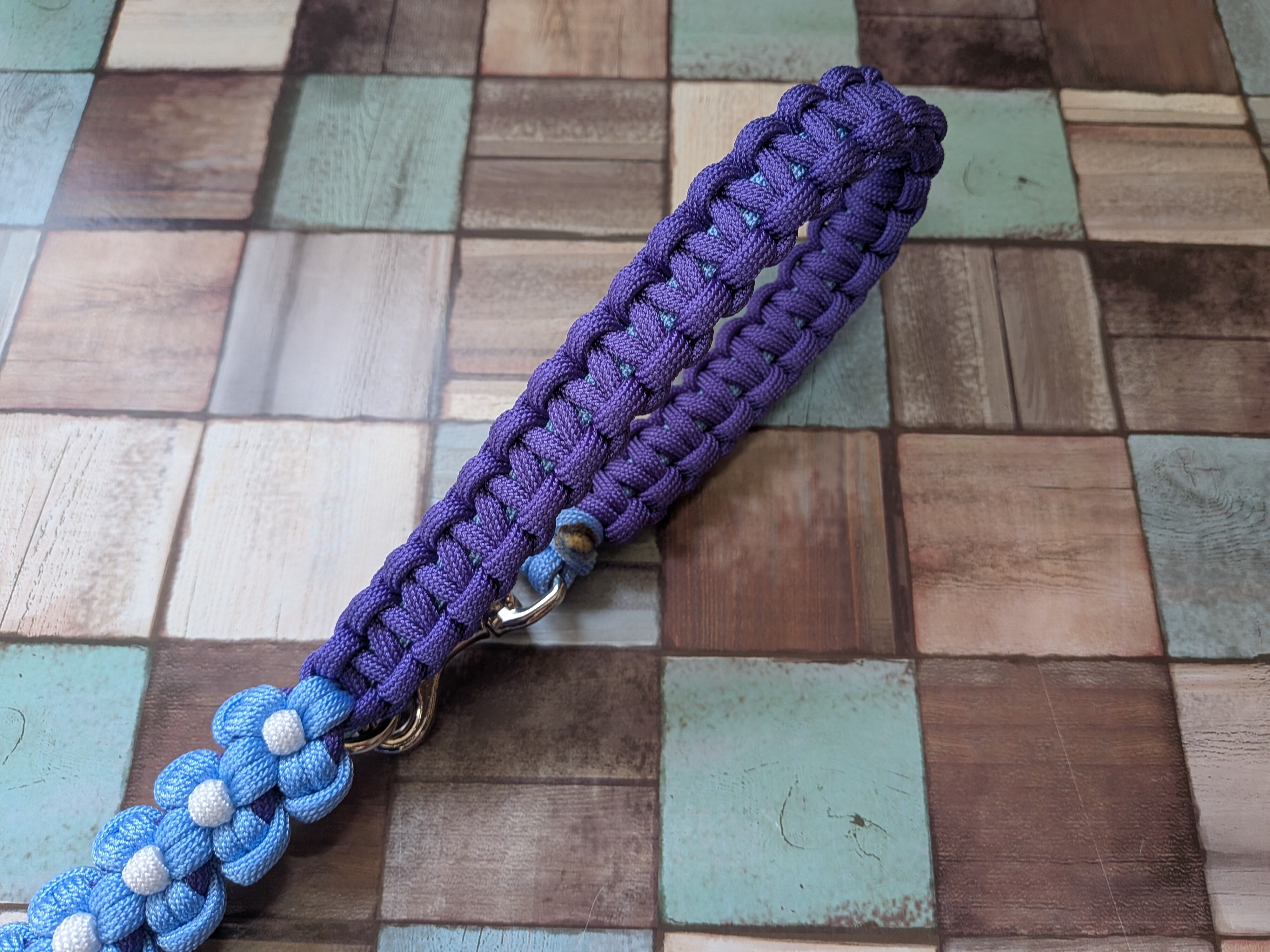 水色と紫色と黒色のパラコードで編み込んでおります。
