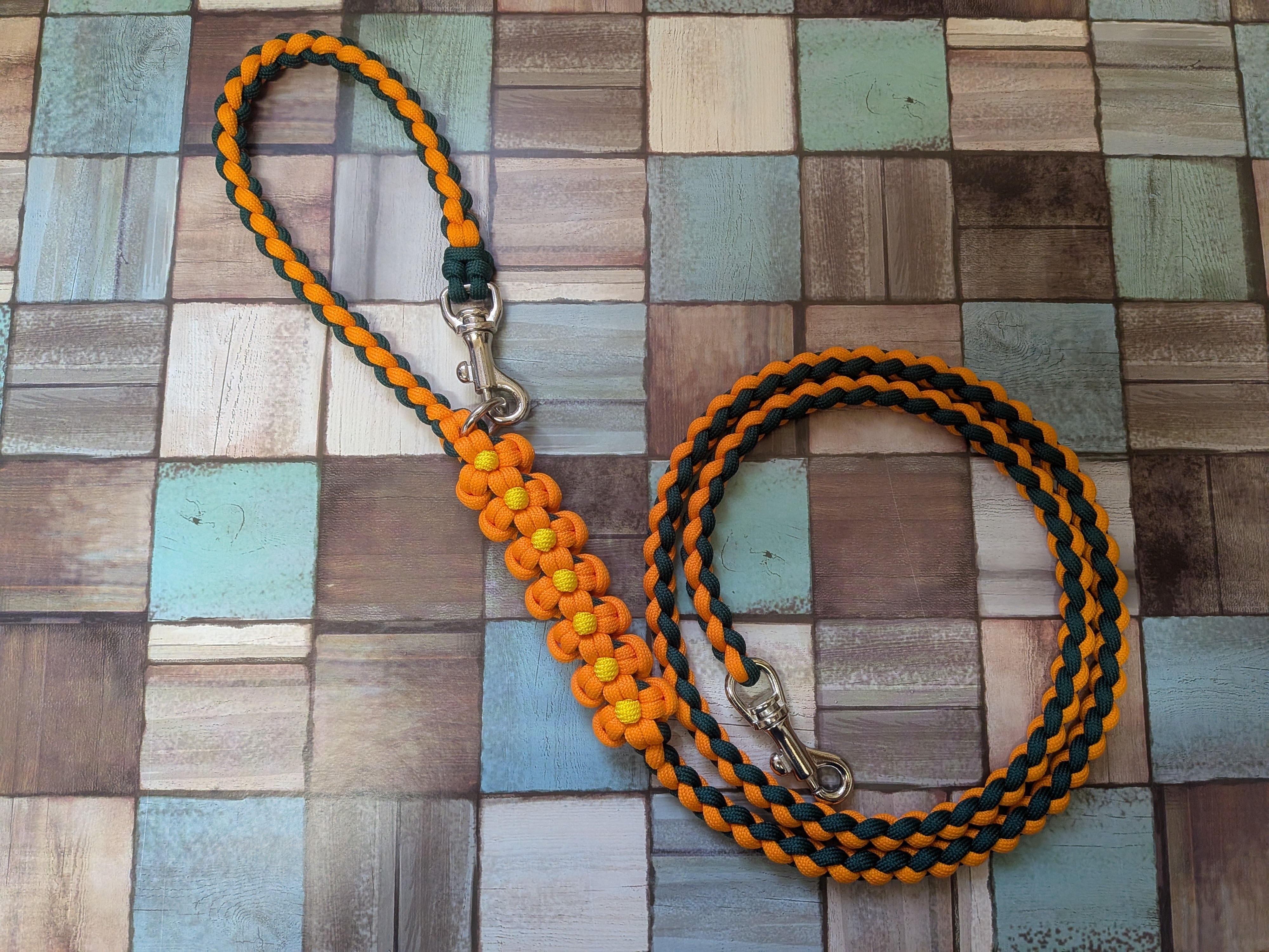 オレンジ色とグリーン色のパラコードで編み込んでおります。
