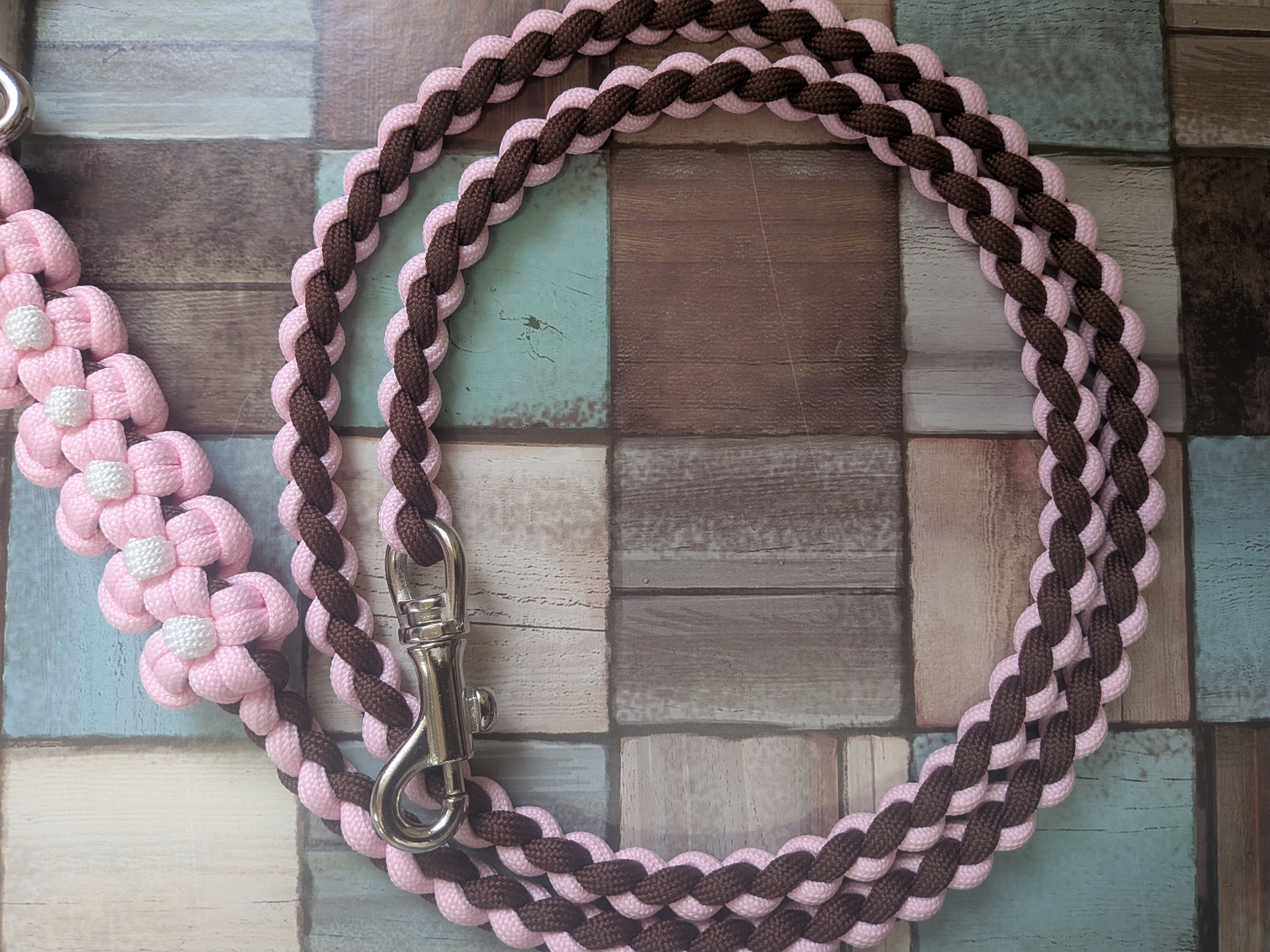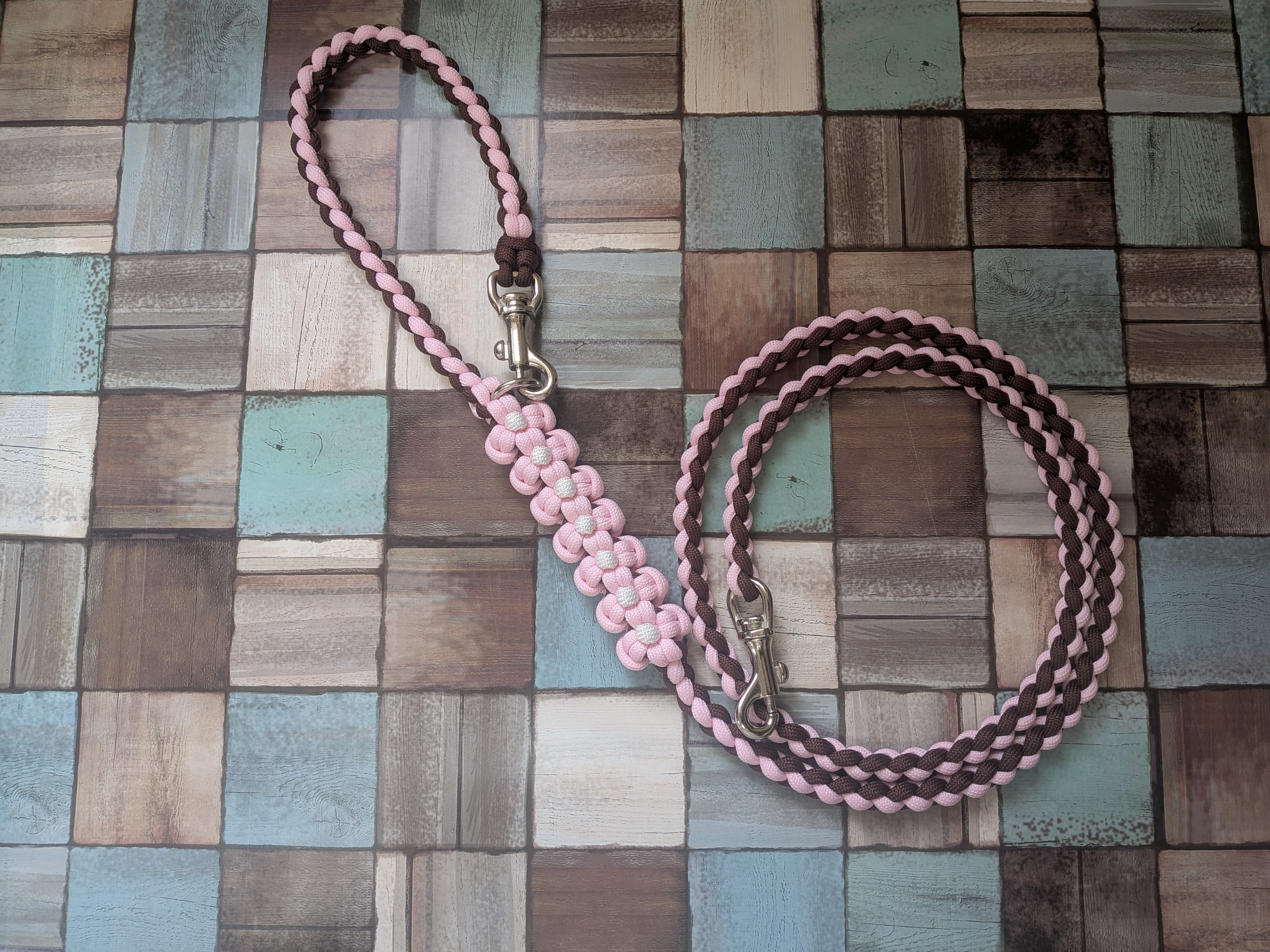 ピンク色とモカ色のパラコードで編み込んでおります。
