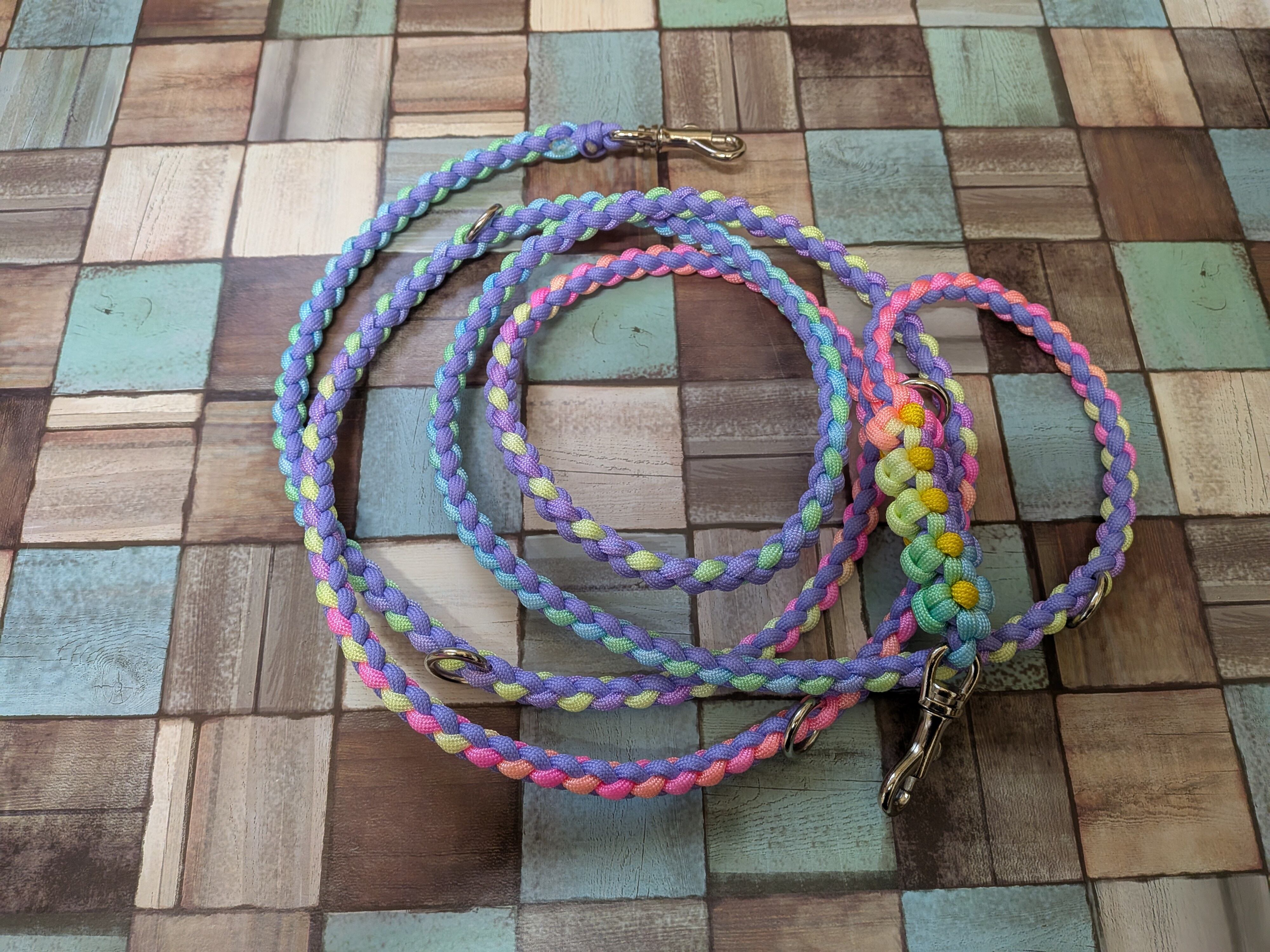 パステルレインボー色(4mm7芯)と薄紫色の(4mm9芯)パラコードで編み込んでおります。