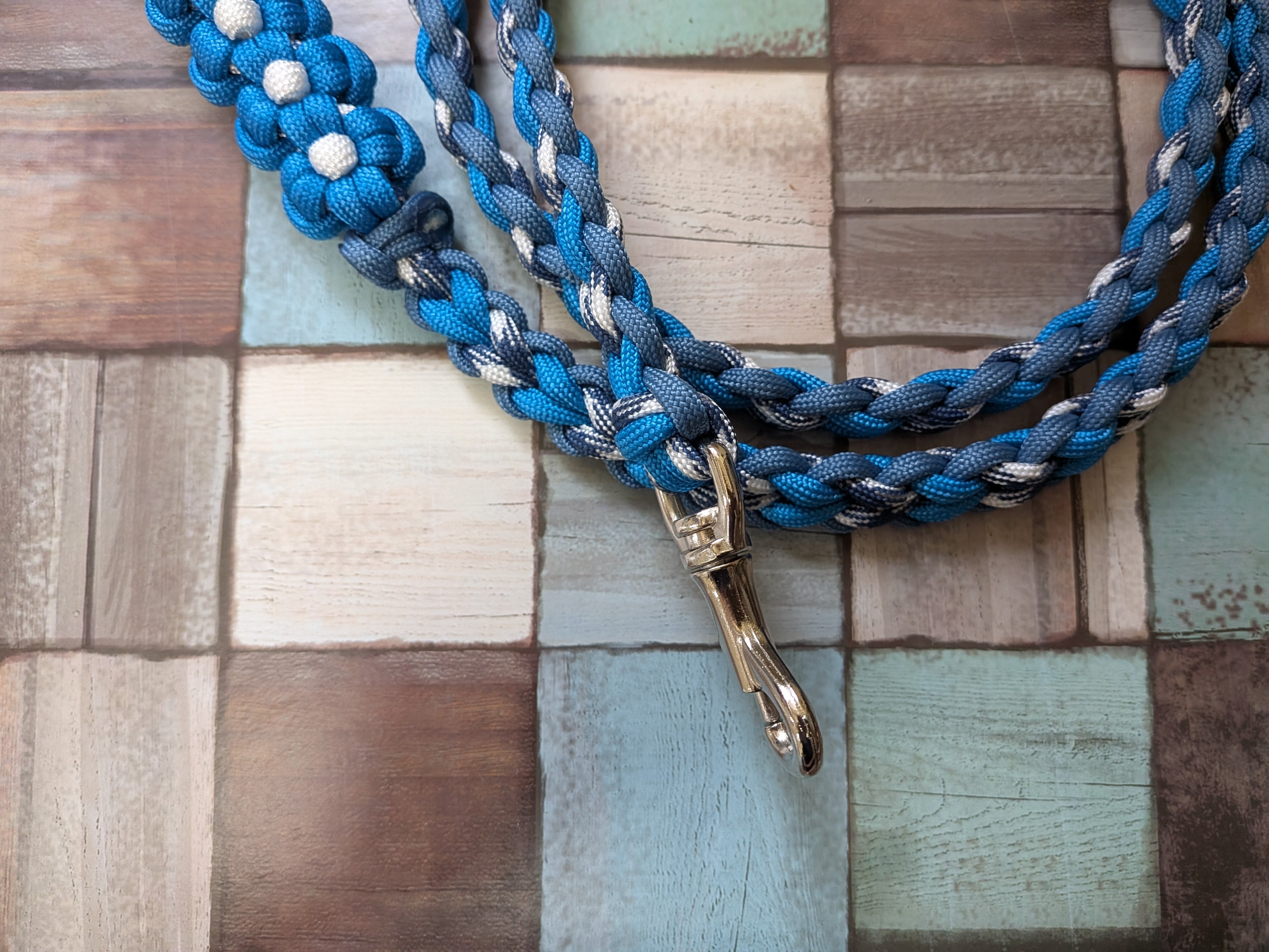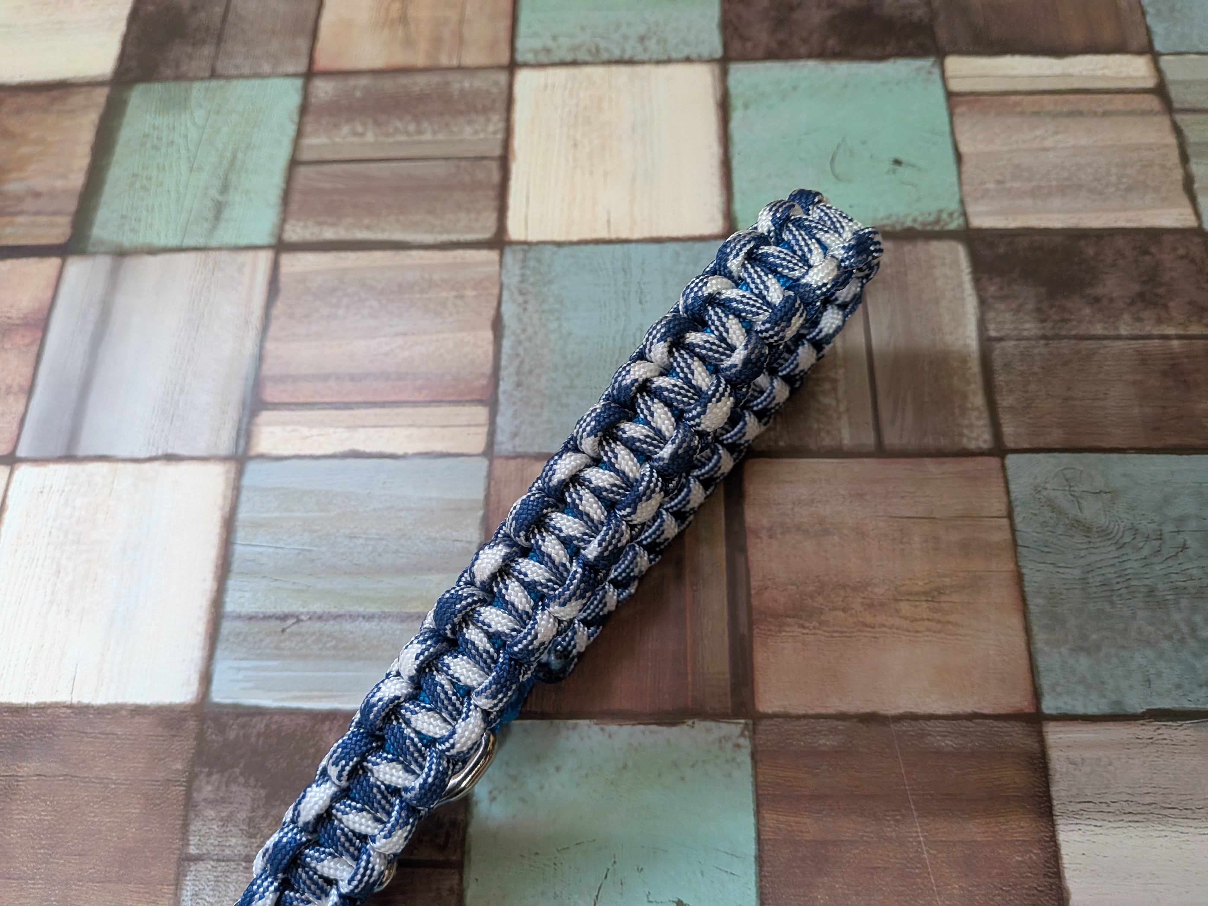 ブルー色とネイビー&ホワイト色とセルリアンブルー色のパラコードで編み込んでおります。