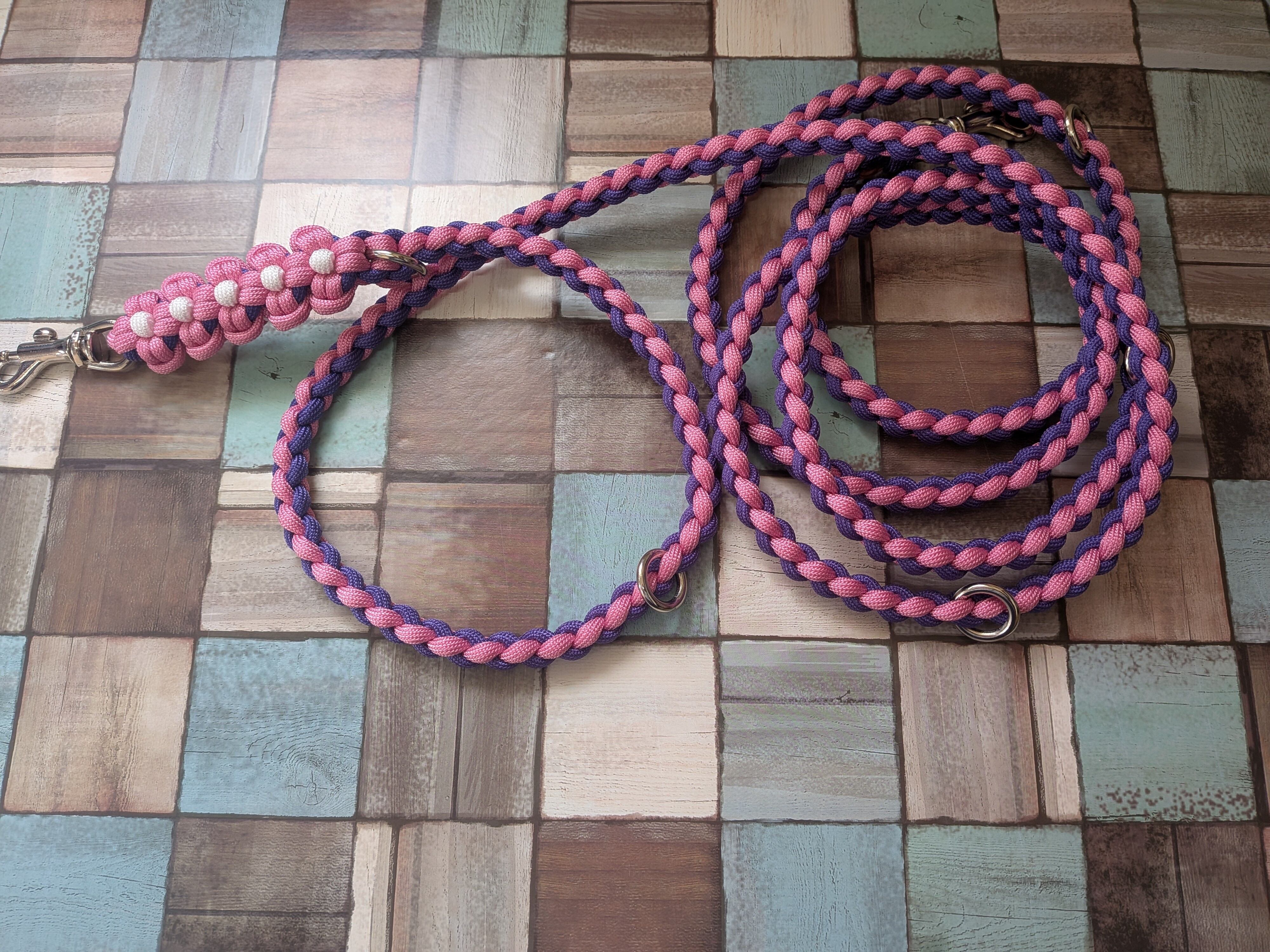 ピンク色と紫色のパラコードで編み込んでおります。