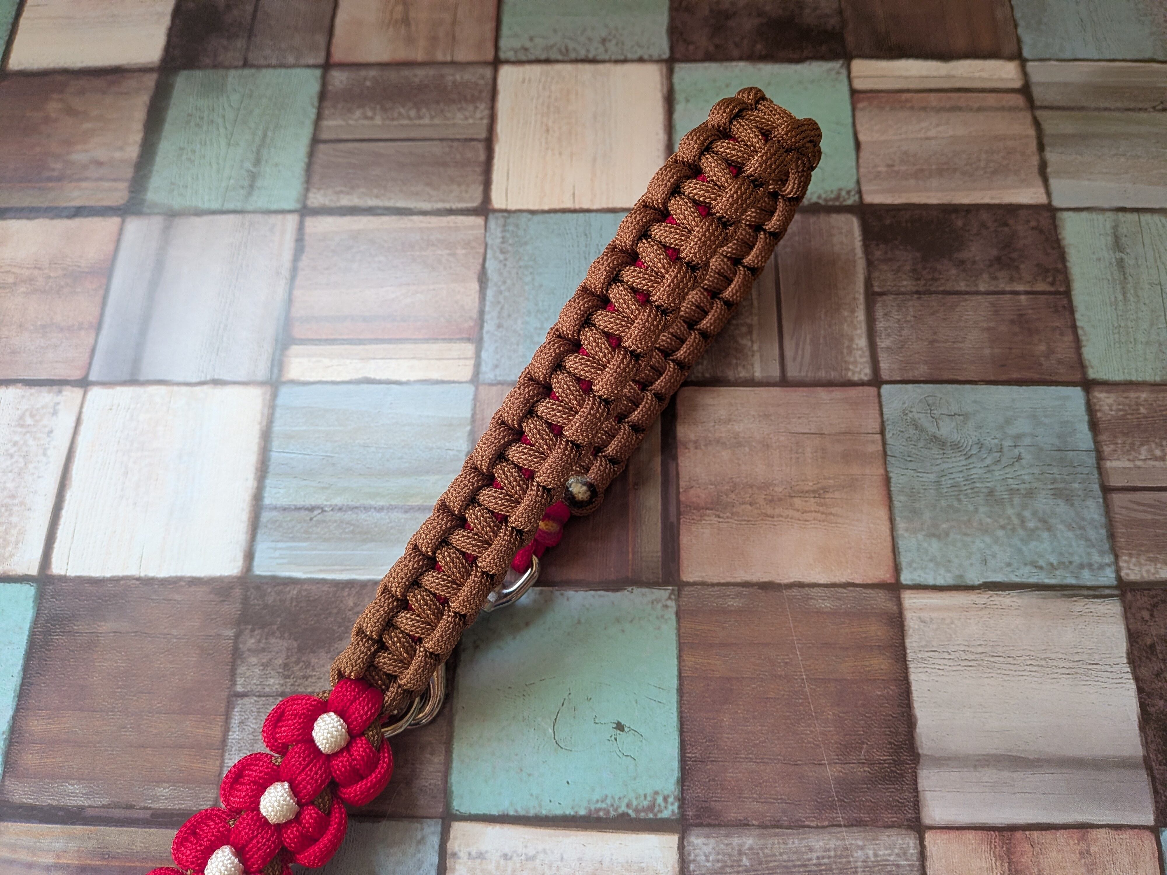 赤色と茶色とベージュ色のパラコードで編み込んでおります。