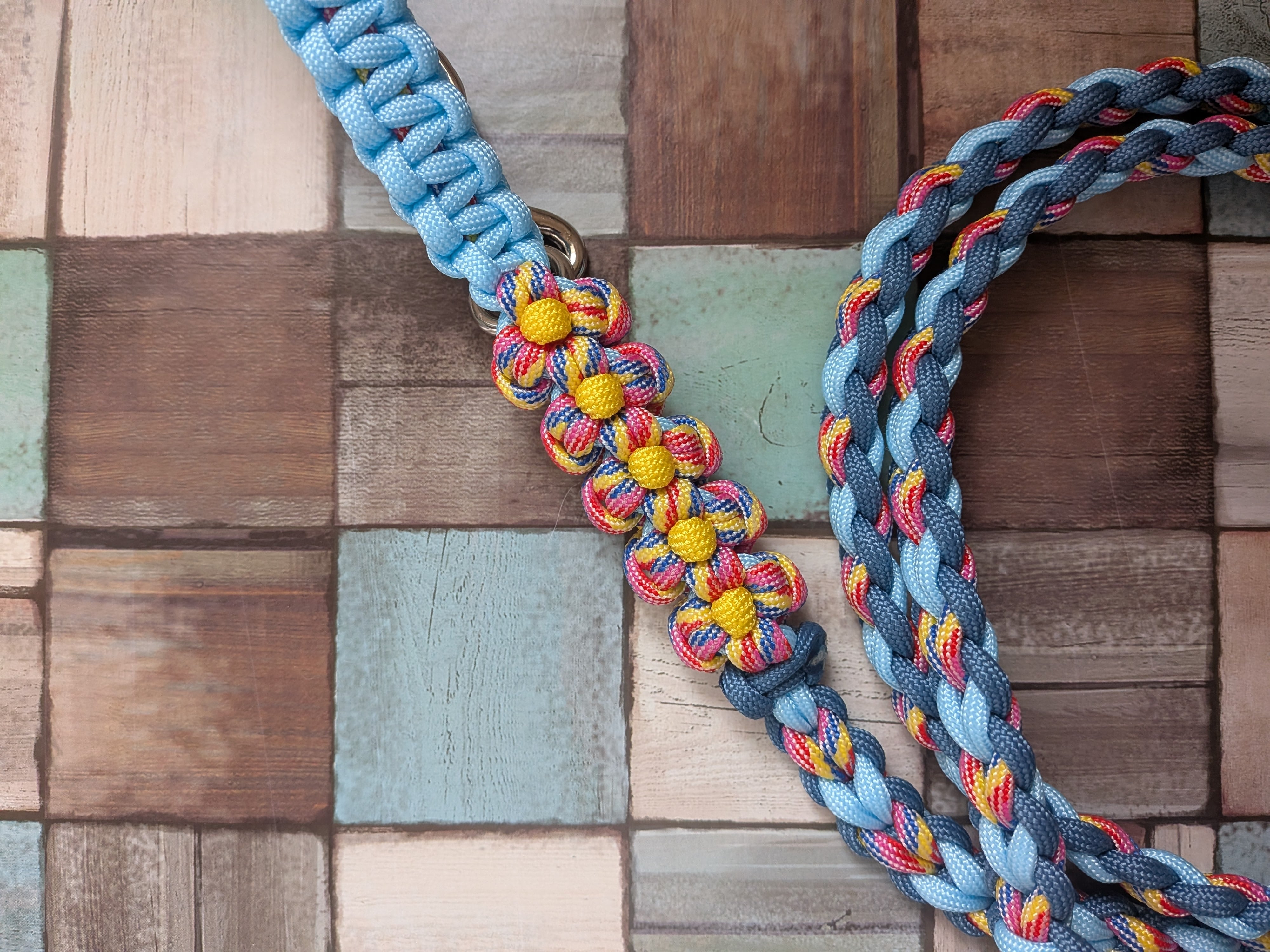 キャンディポップ色とパステルブルー色とセルリアンブルー色のパラコードで編み込んでおります。