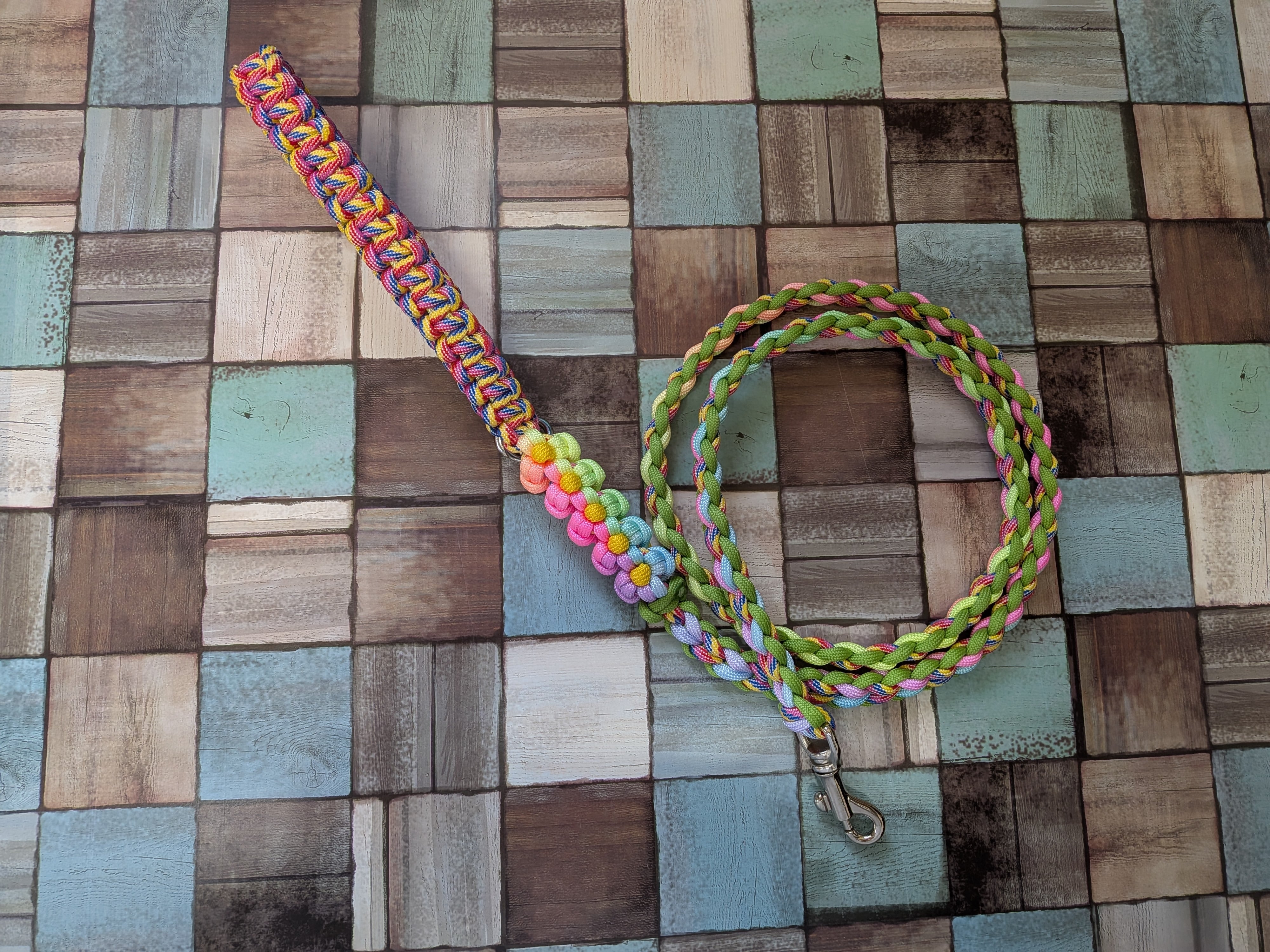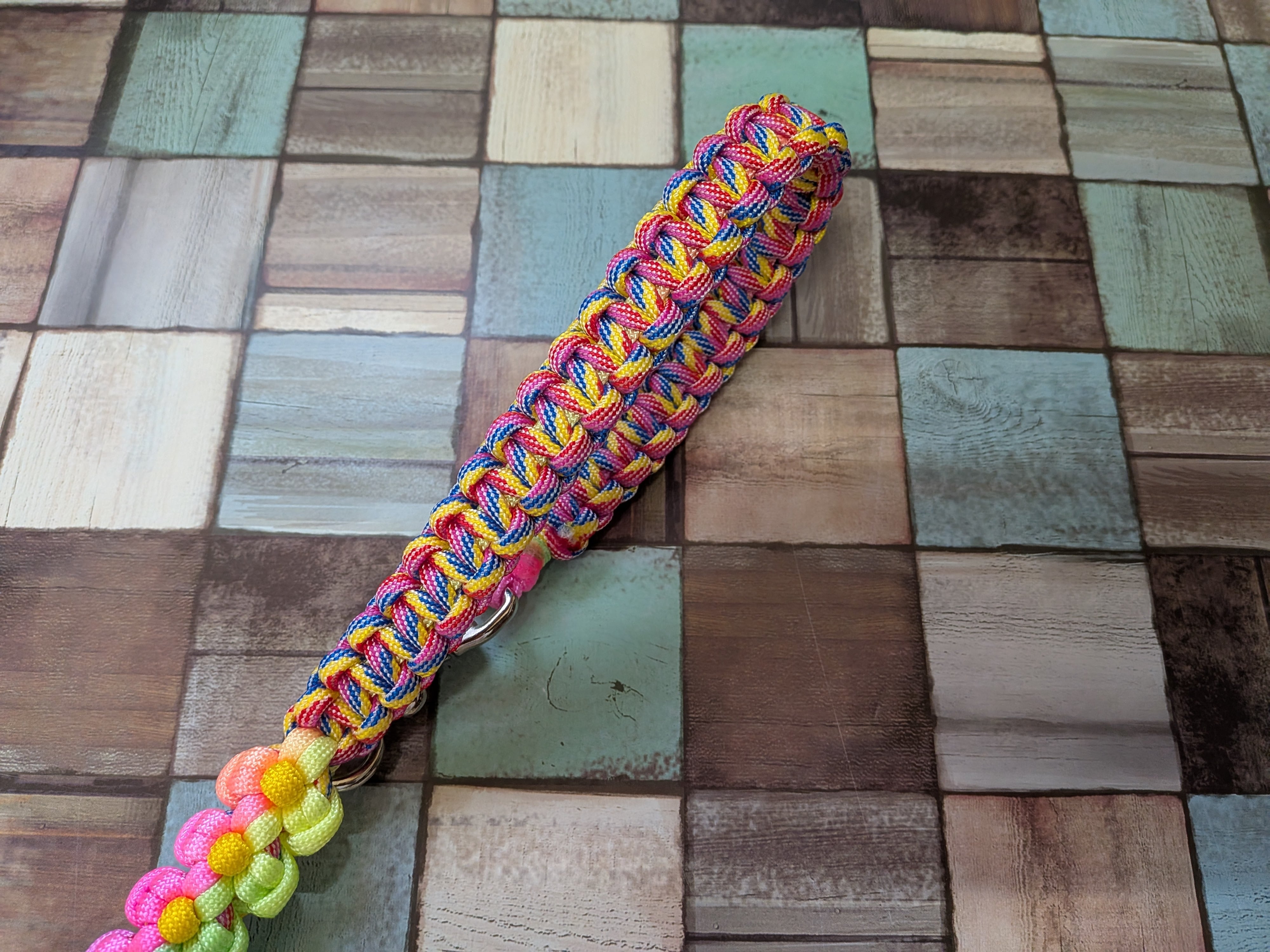 パステルレインボー色とキャンディポップ色とスプリンググリーン色のパラコードで編み込んでおります。