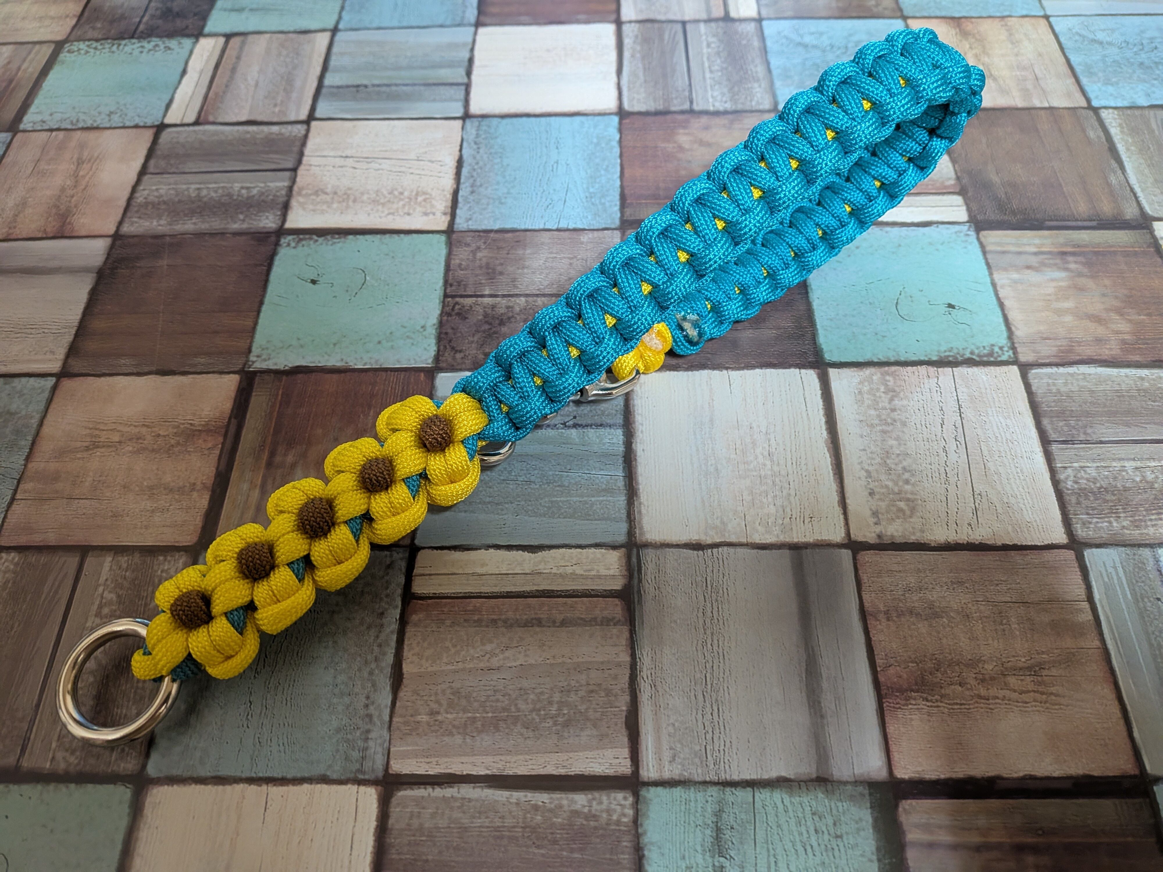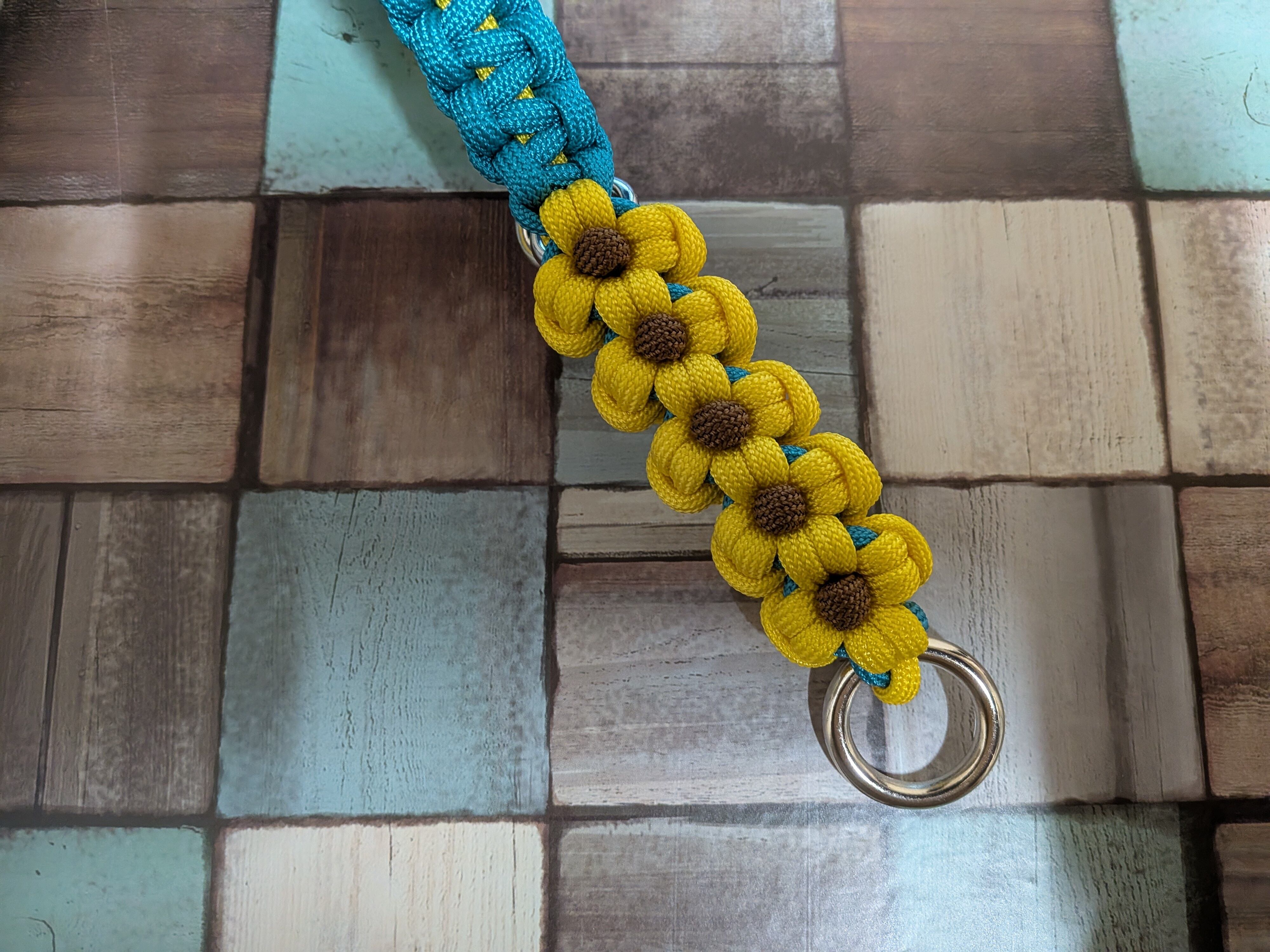 黄色と青緑色のパラコードで編み込んでおります。