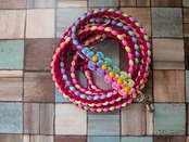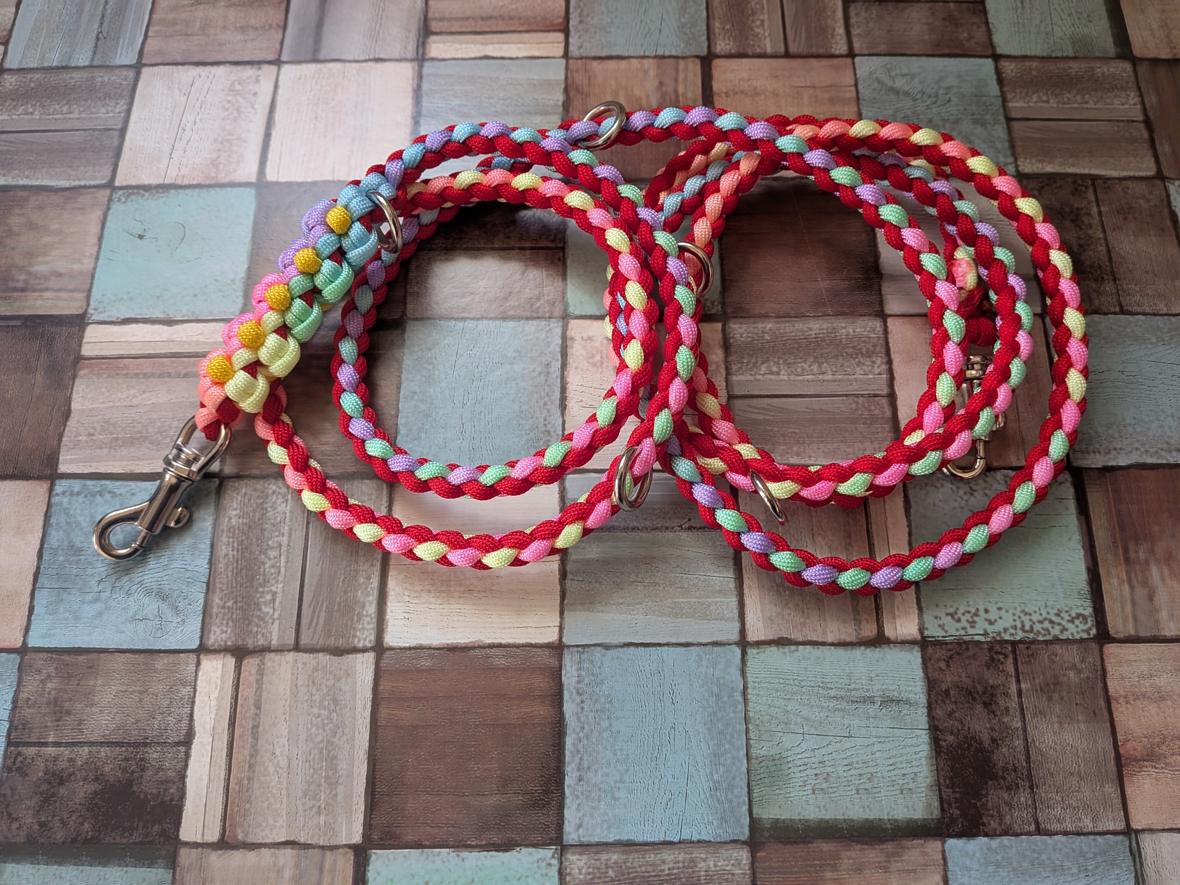 パステルレインボー色(4mm7芯)と赤色の(4mm9芯)パラコードで編み込んでおります。