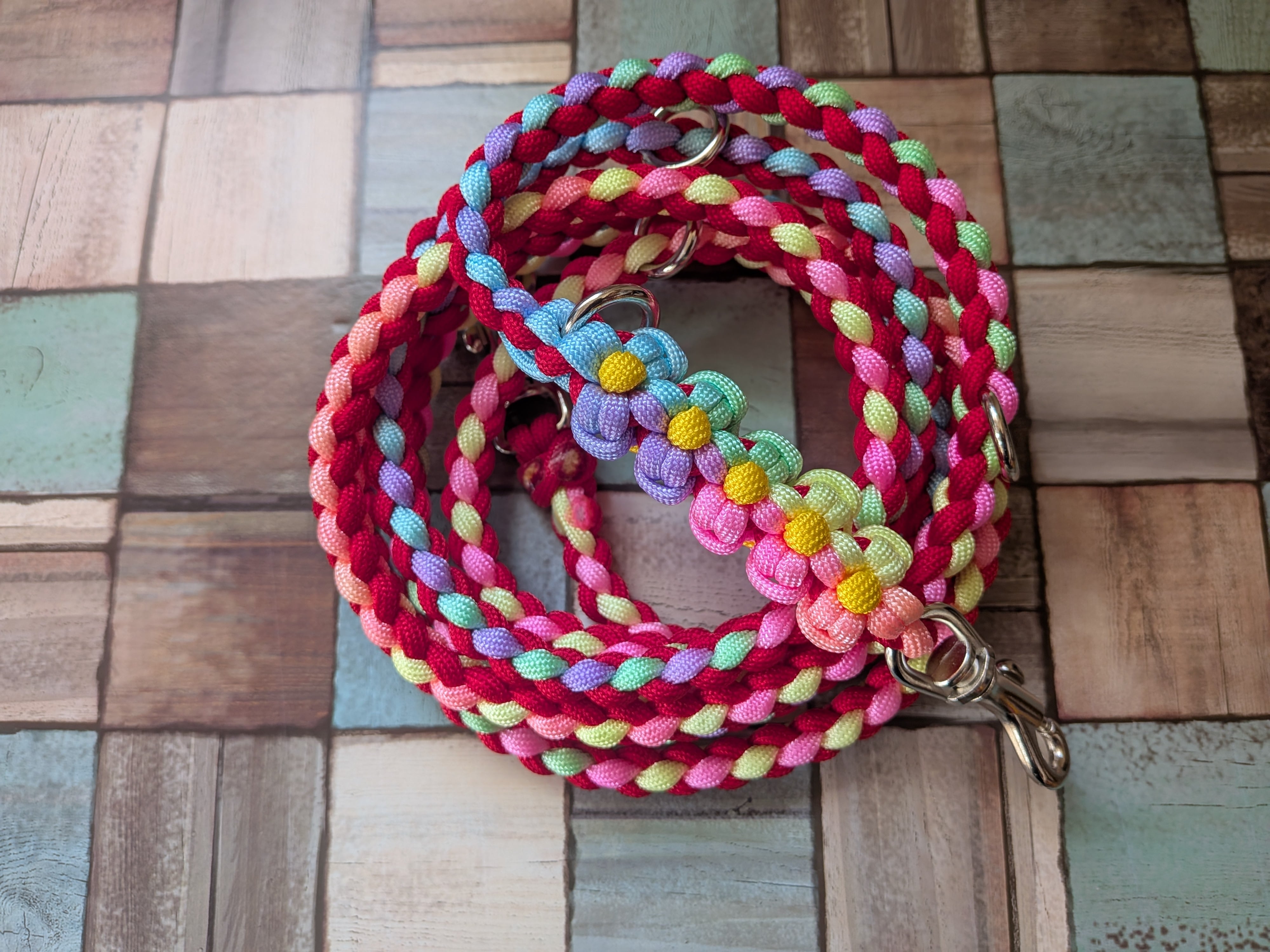 ⚠️4mm7芯(パステルレインボー)と4㎜9芯(赤色)のパラコードで編みました。4mm7芯を組み合わせているため少し細めで、お花も小さめです。