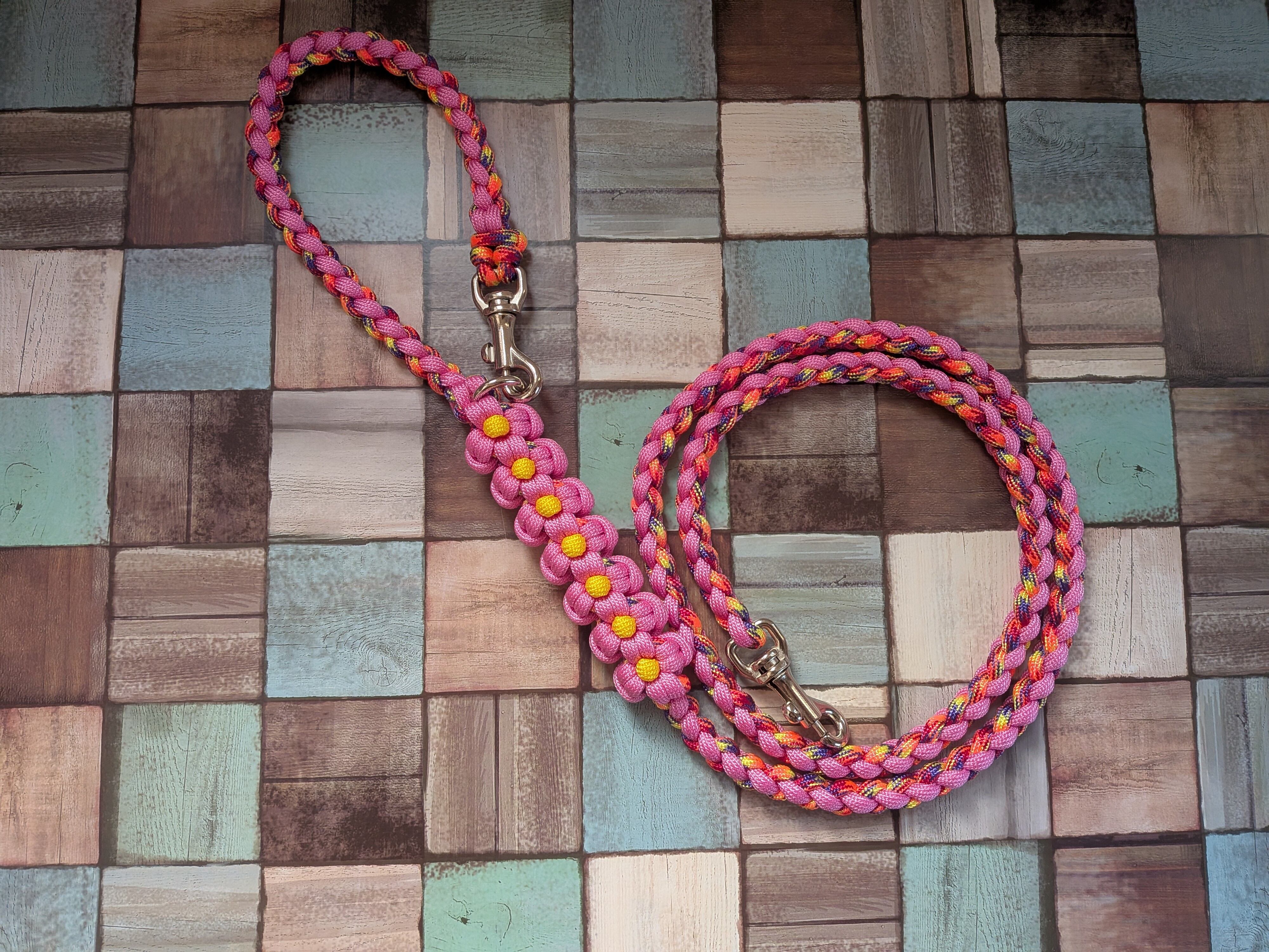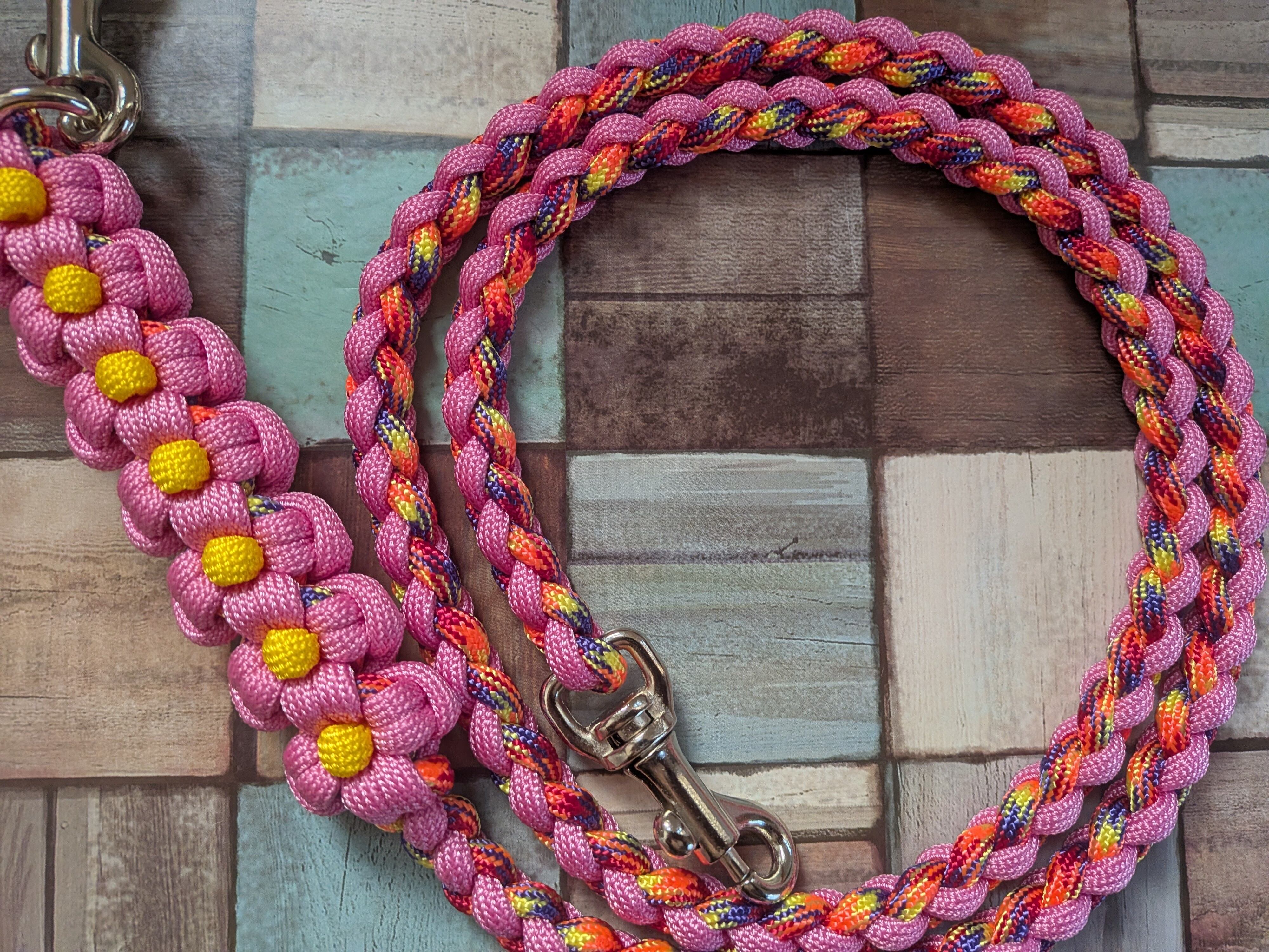 ピンク色とオレンジ迷彩柄のパラコードで編み込んでおります。