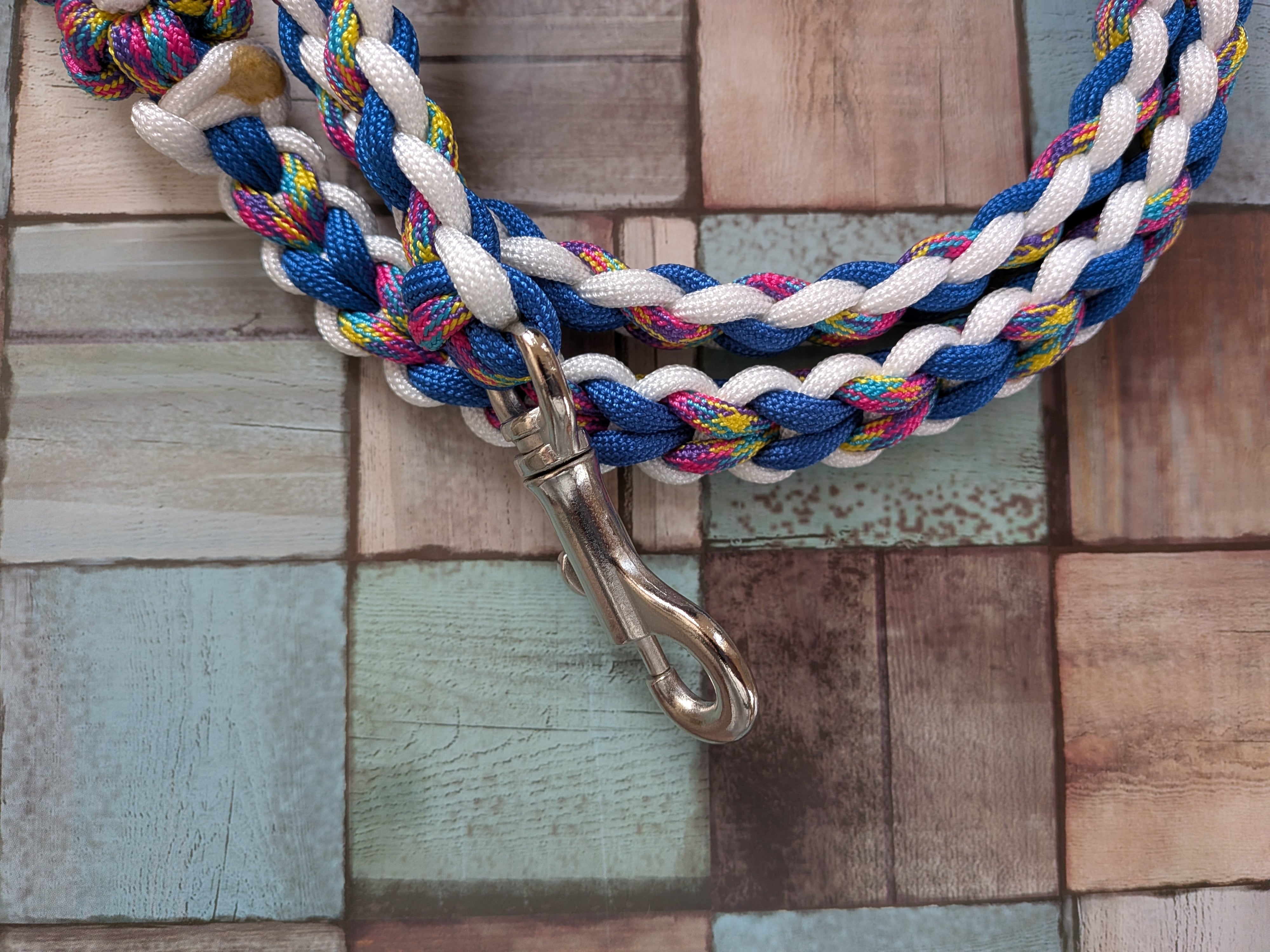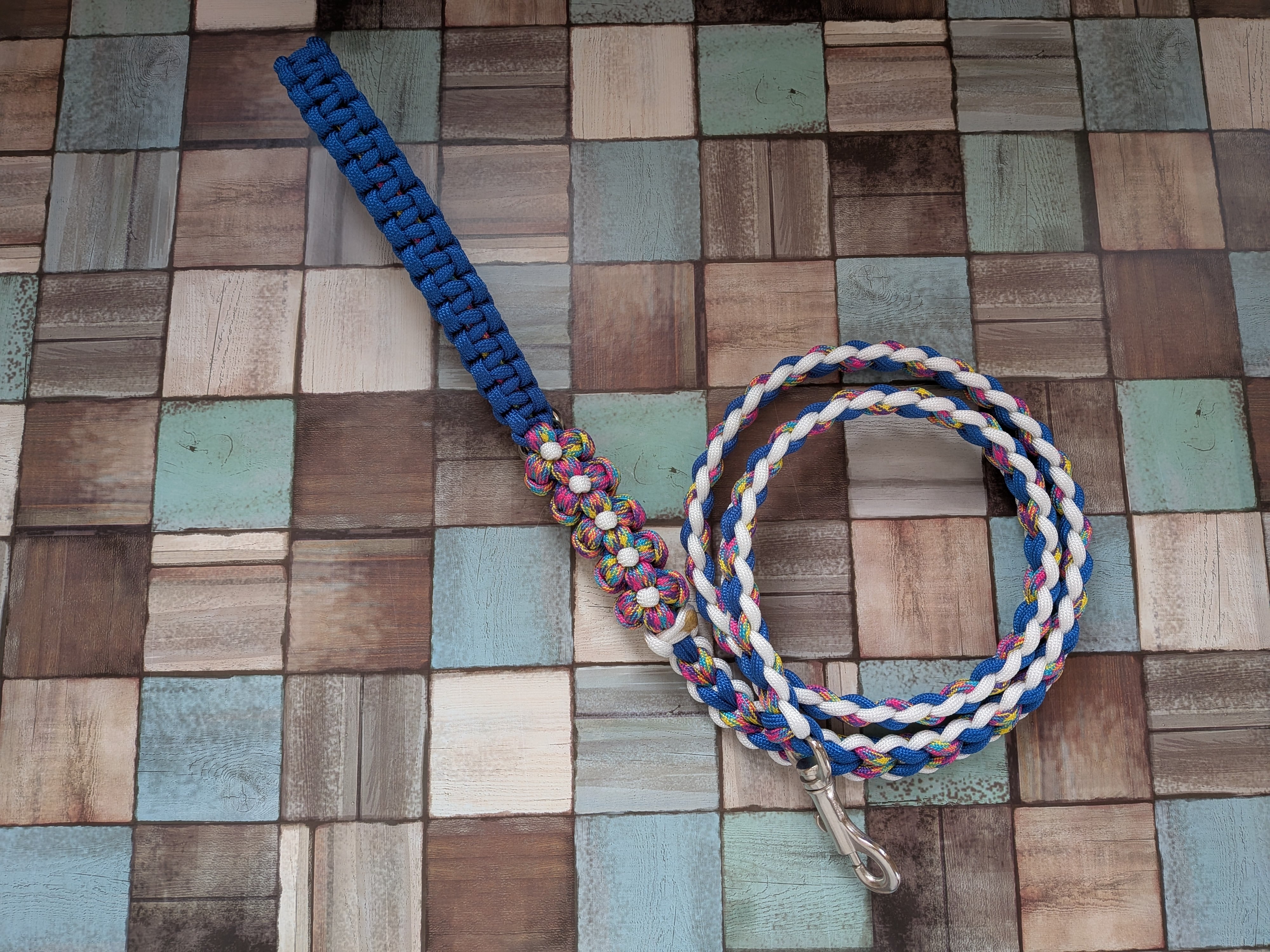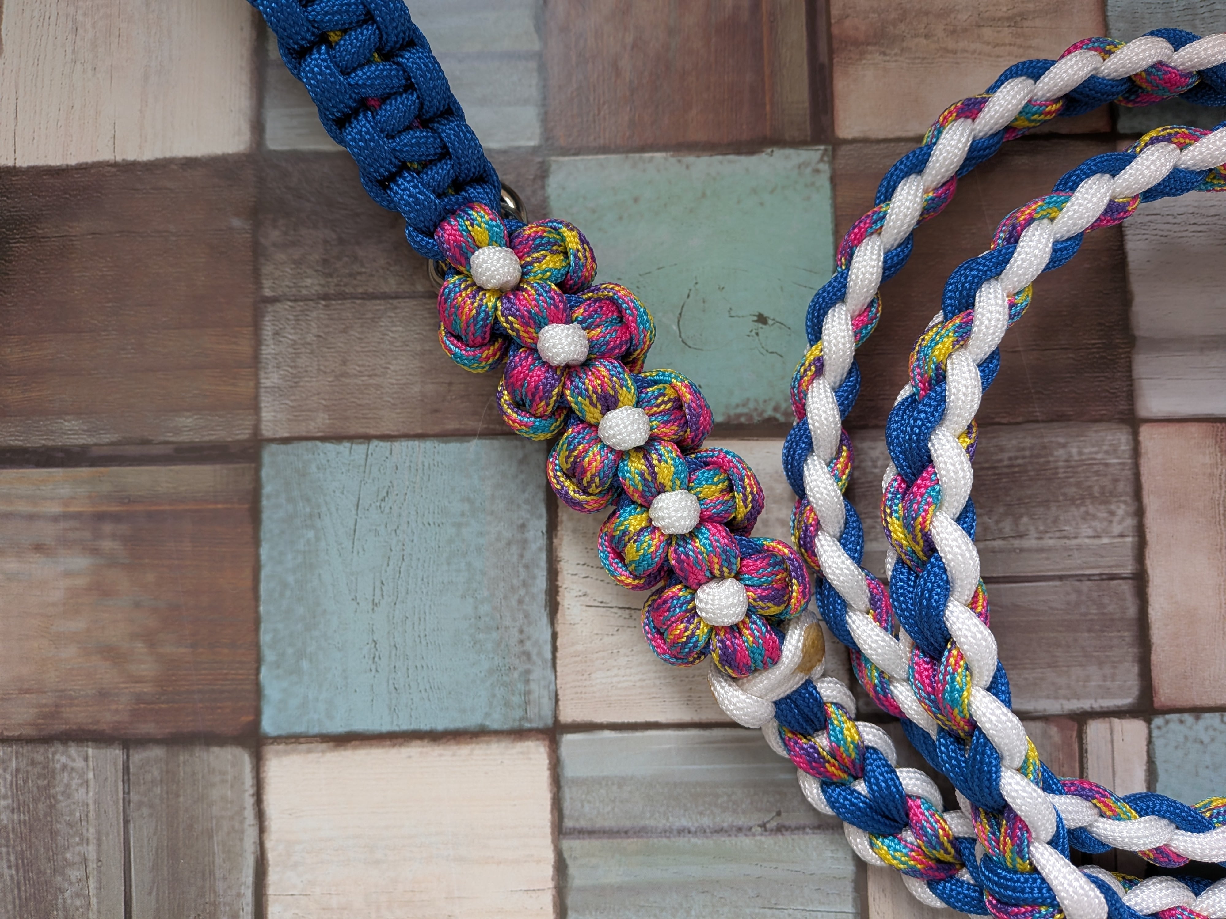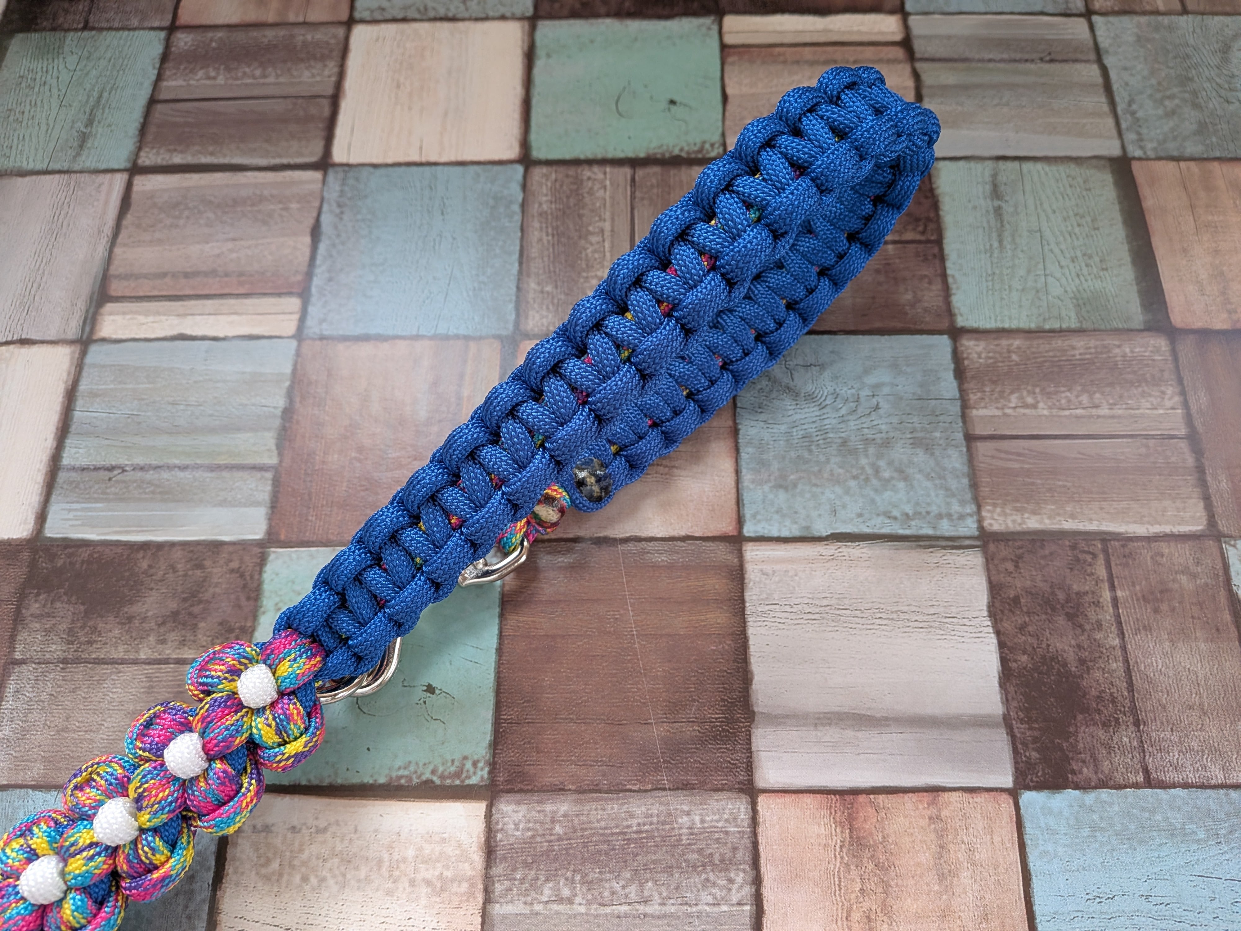 レインボー色と青色と白色のパラコードで編み込んでおります。