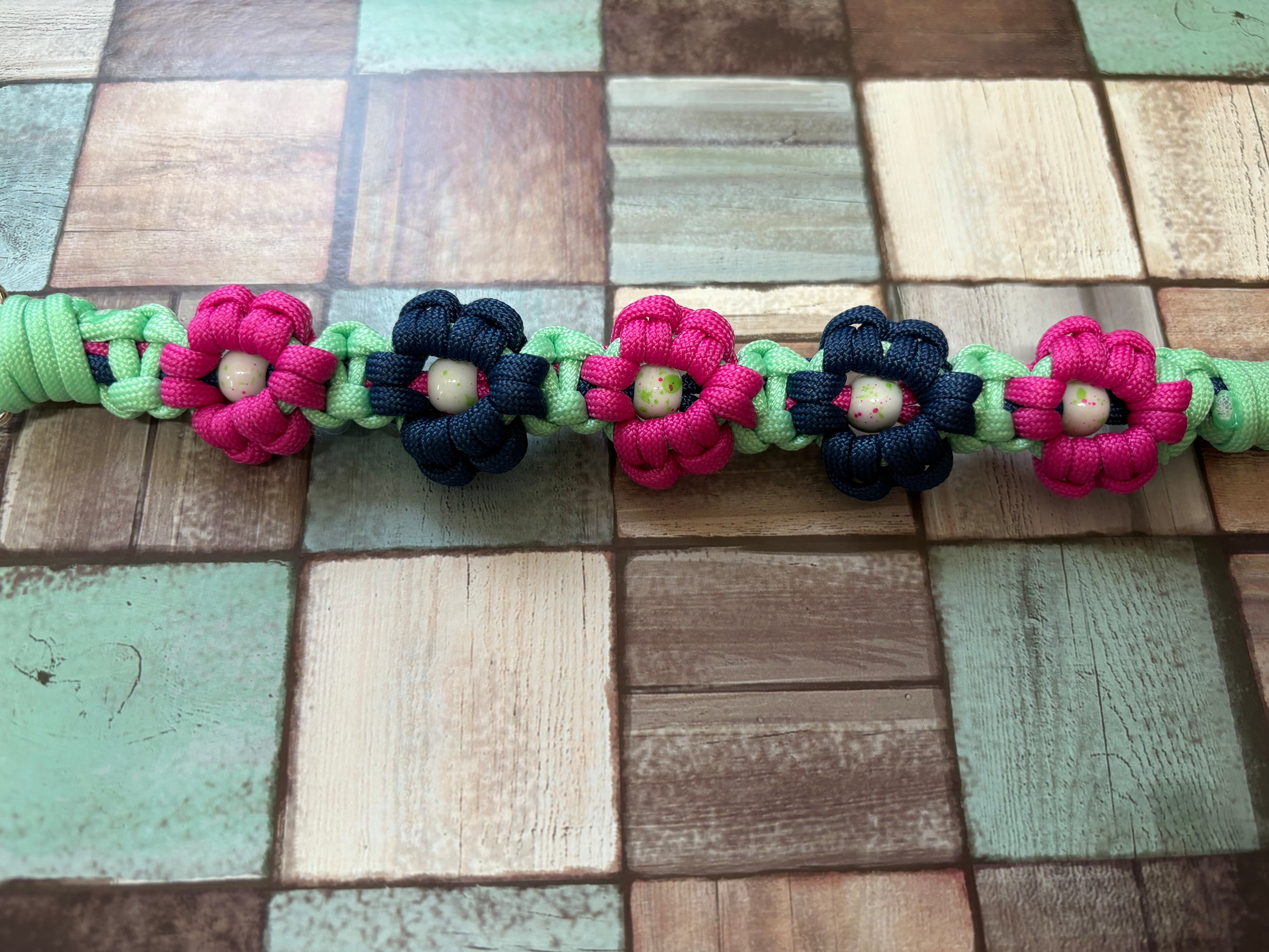 マゼンタ色とネイビー色とライムグリーン色のパラコードで編み込んでおります。