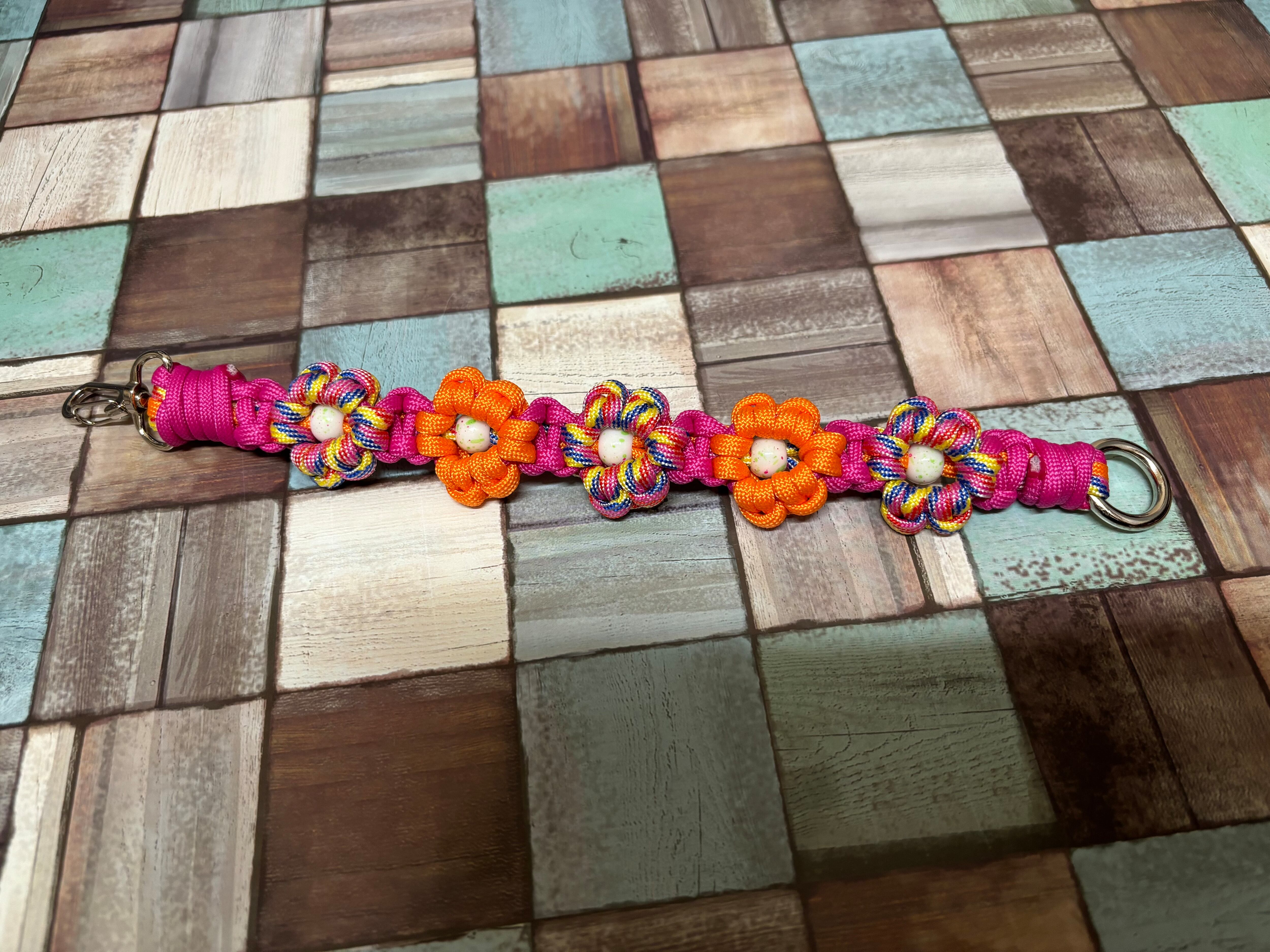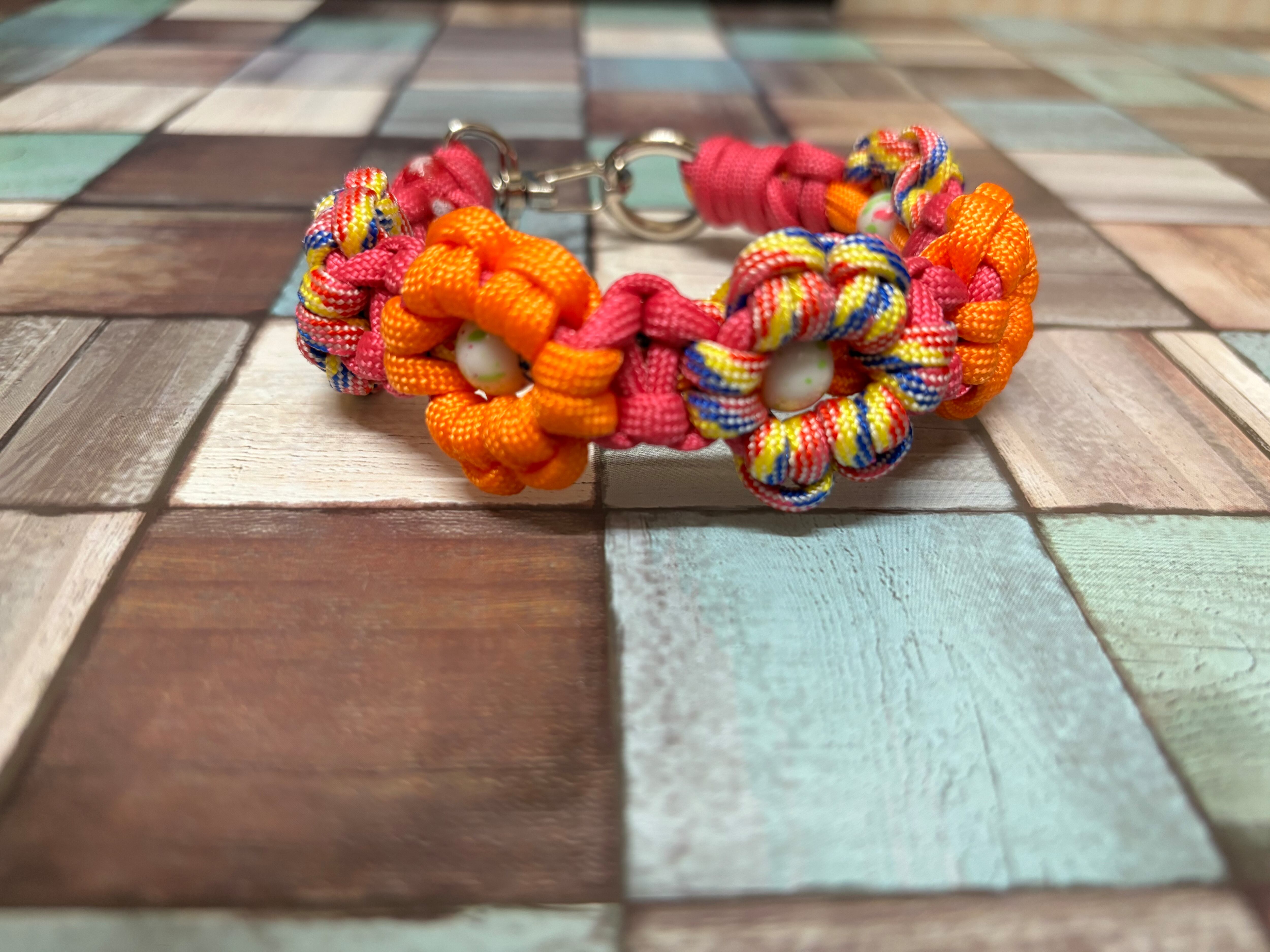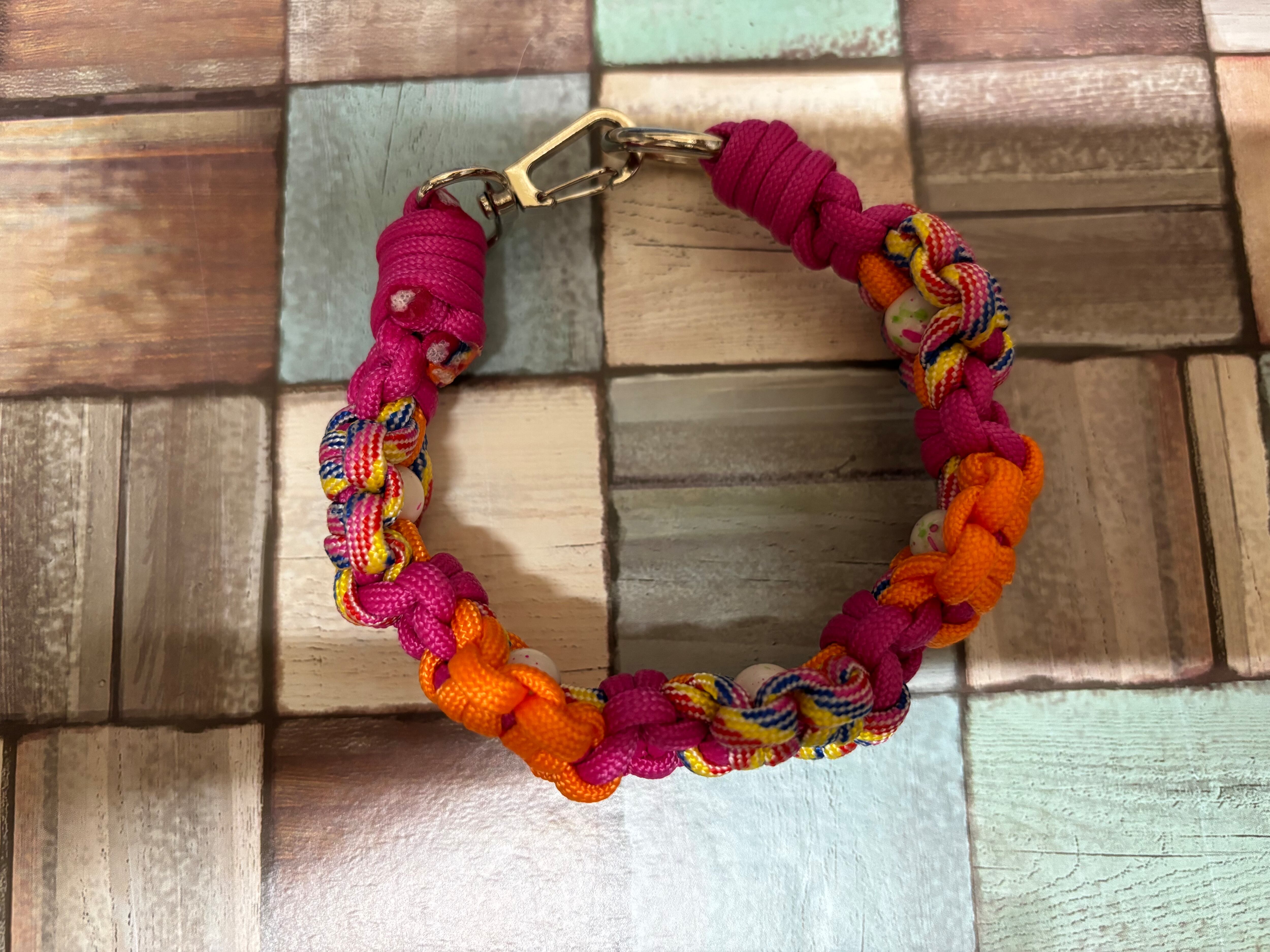 チューリップ色とオレンジ色とマゼンタ色のパラコードで編み込んでおります。