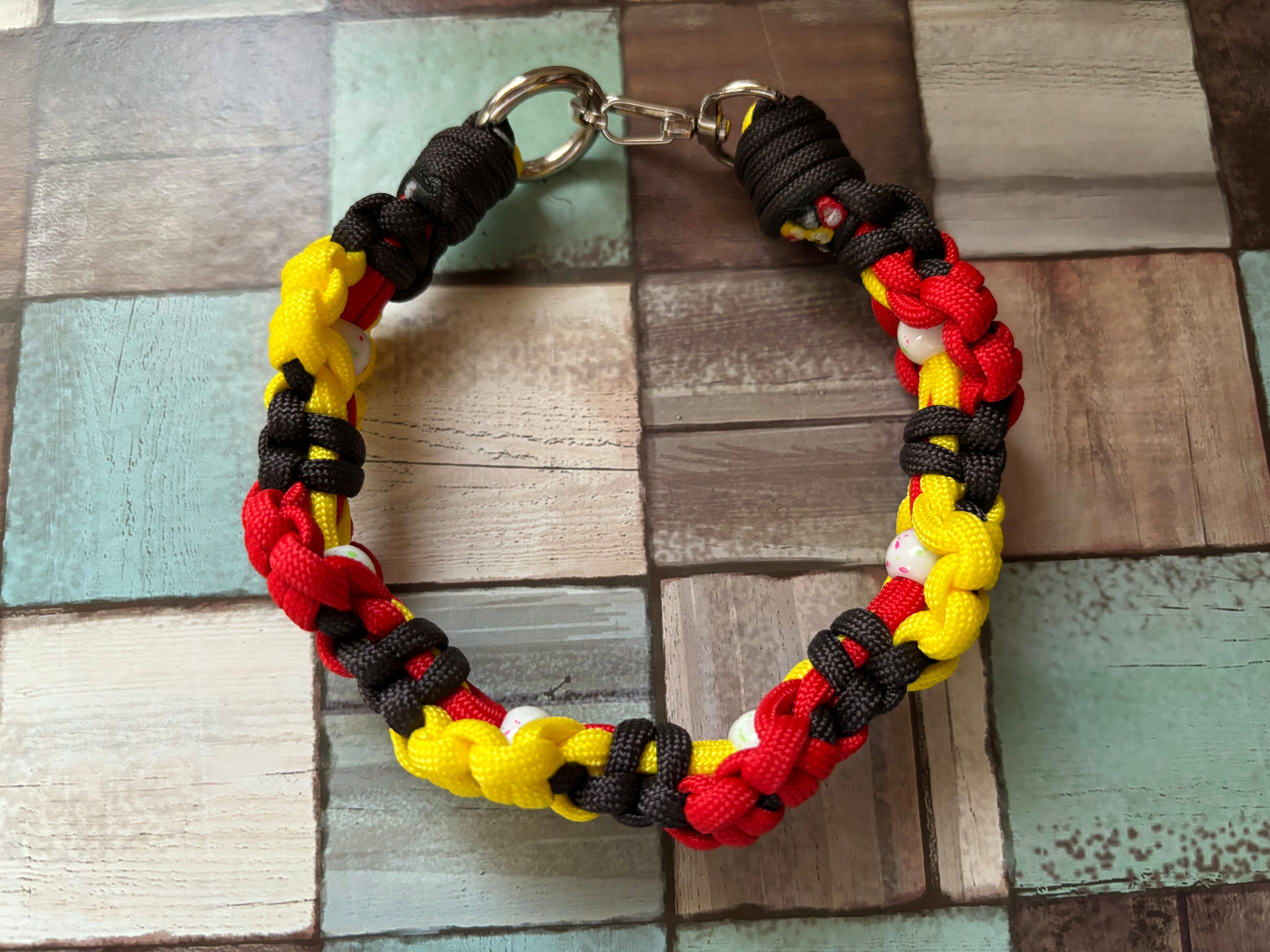 赤色と黄色とダークブラウン色のパラコードで編み込んでおります。