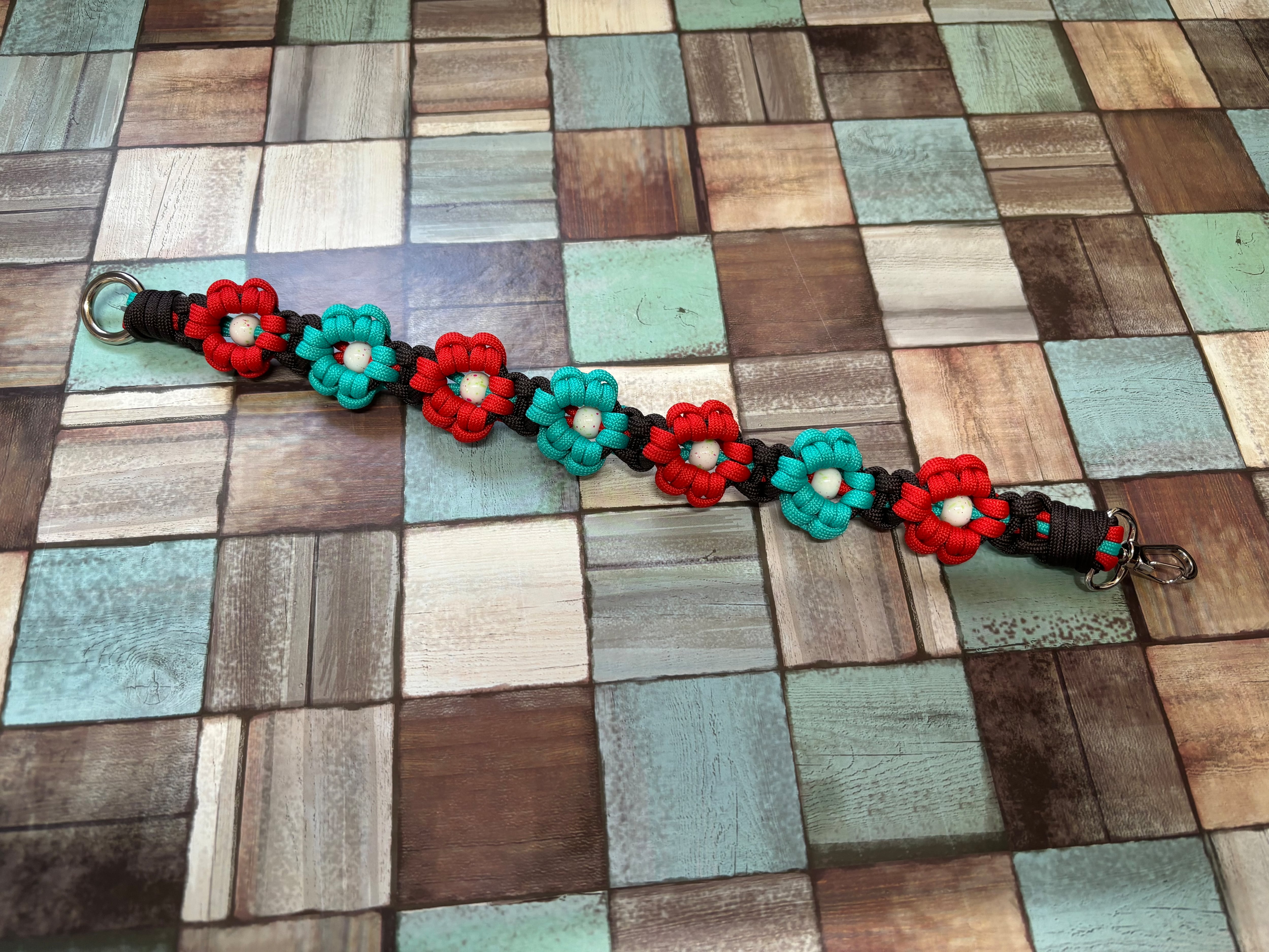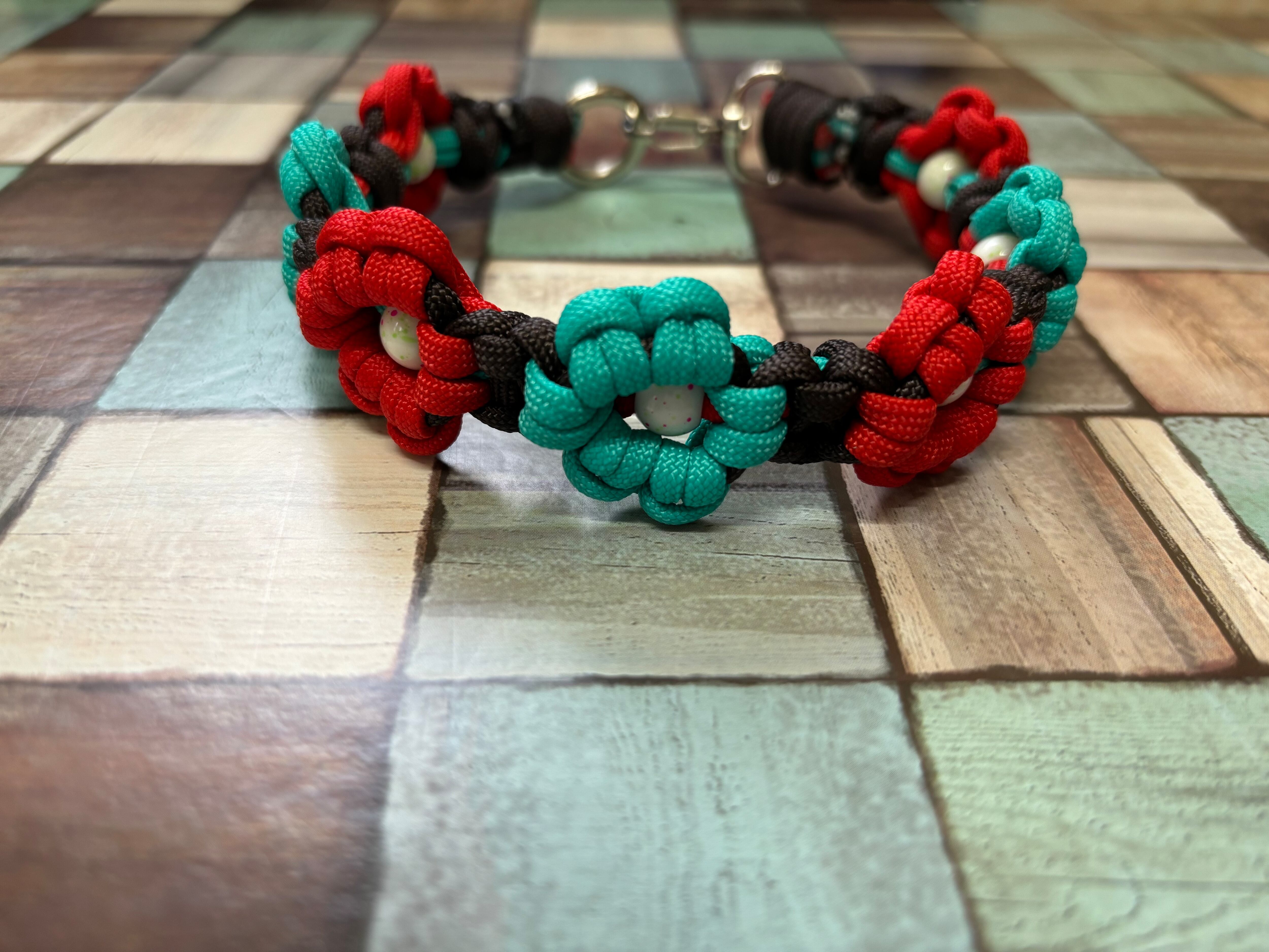 赤色とエメラルドグリーン色とダークブラウン色のパラコードで編み込んでおります。
